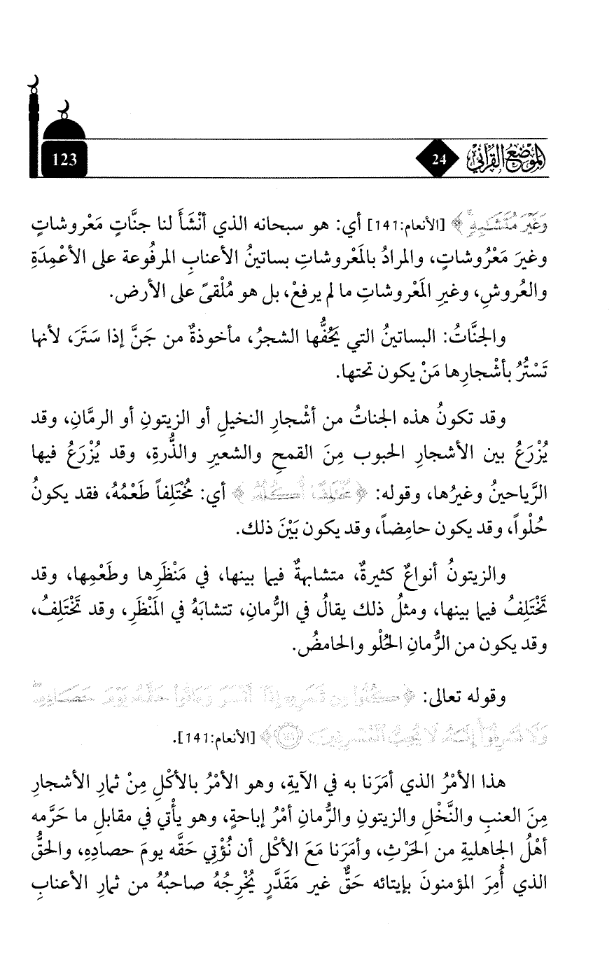 وَغَيْرَ مُتَشَابِهٍ} [الأنعام: 141] أي: هو سبحانه الذي أنشأ لنا جنَّاتٍ معروشاتٍ وغير معروشاتٍ, والمراد بالمعروشات بساتين الأعناب المرفوعة على الأعمدة والعروش, وغير المعروشات ما لم يرفع, بل هو ملقى على الأرض.