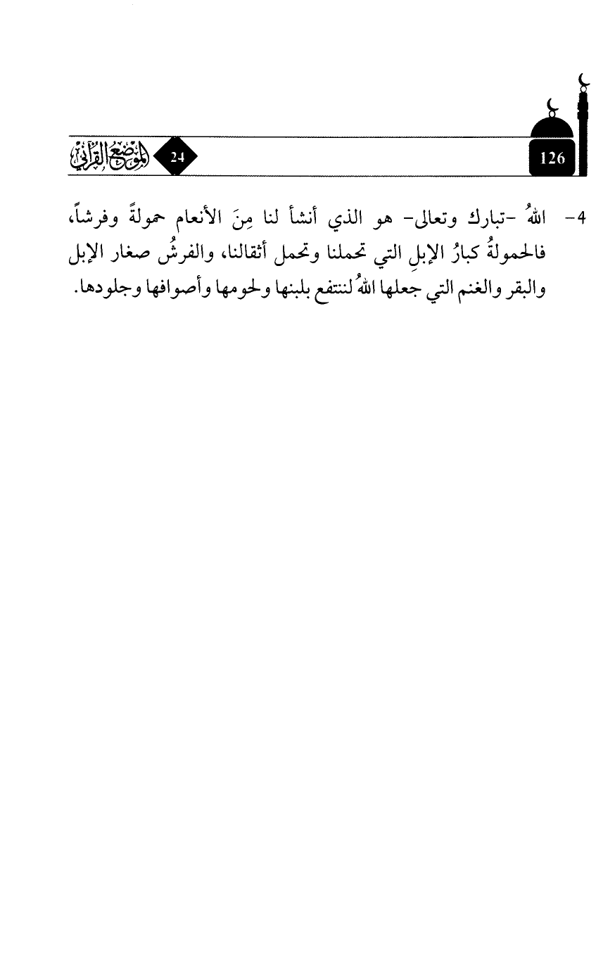 4 - الله - تبارك وتعالى - هو الذي أنشأ لنا من الأنعام حمولةً وفرشاً, فالحمولة كبار الإبل التي تحملنا وتحمل أثقالنا, والفرش صغار الإبل والبقر والغنم التي جعلها الله لننتفع بلبنها ولحومها وأصوافها وجلودها.
