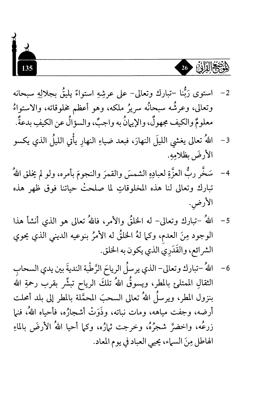 2 - استوى ربُّنا - تبارك وتعالى - على عرشه استواءً يليق بجلاله سبحانه وتعالى, وعرشه سبحانه سرير ملكه, وهو أعظم مخلوقاته, والاستواء معلومٌ والكيف مجهولٌ, والإيمان به واجبٌ, والسؤال عن الكيف بدعةٌ.