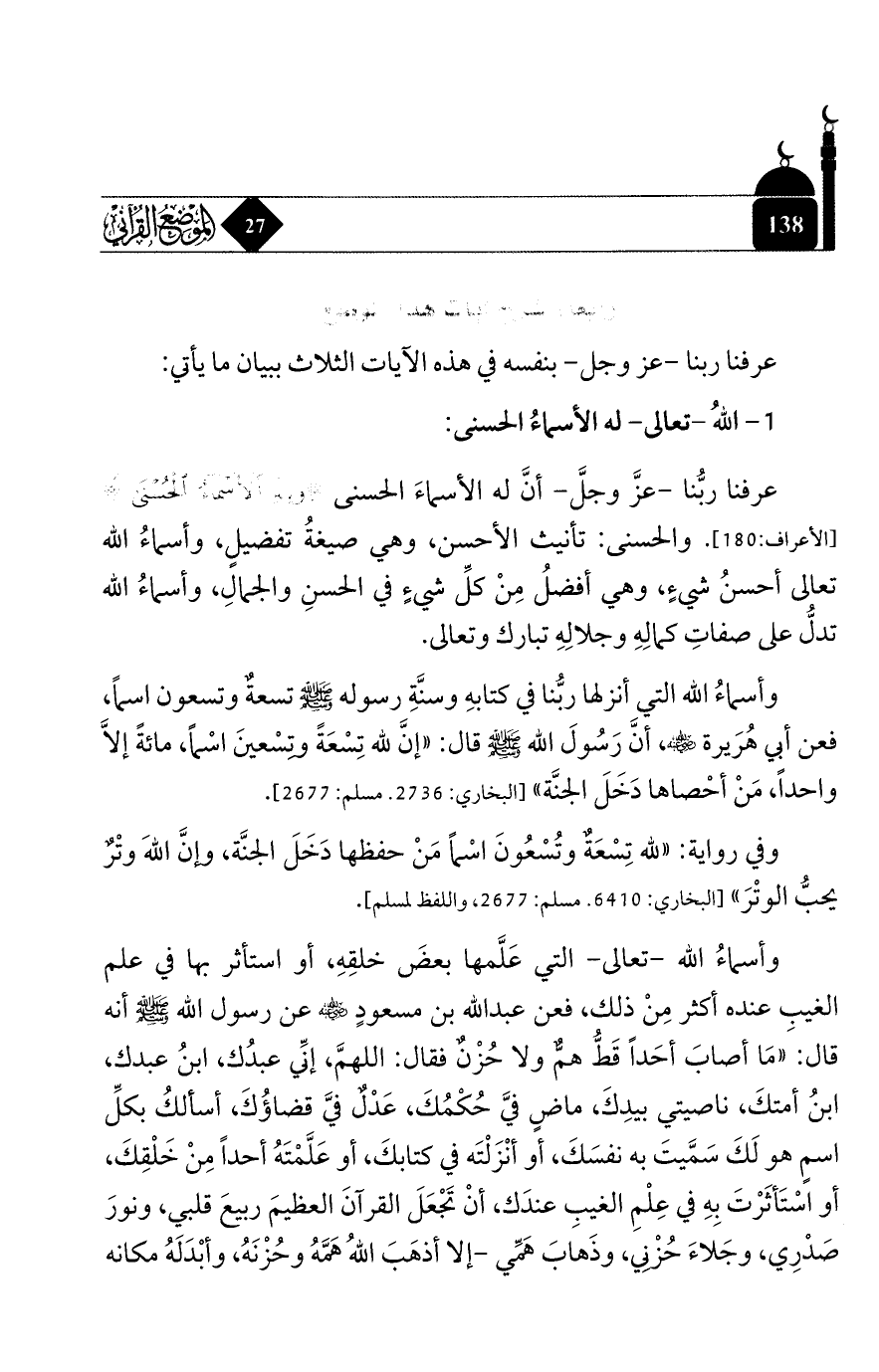 وأسماء الله التي أنزلها ربُّنا في كتابه وسنَّة رسوله - صلى الله عليه وسلم - تسعةٌ وتسعون اسماً, فعن أبي هريرة - رضي الله عنه - , أنَّ رسول الله - صلى الله عليه وسلم - قال: «إنَّ لله تسعةً وتسعين اسماً, مائةً إلا واحداً, من أحصاها دخل الجنَّة» [البخاري: 2736. مسلم: 2677].