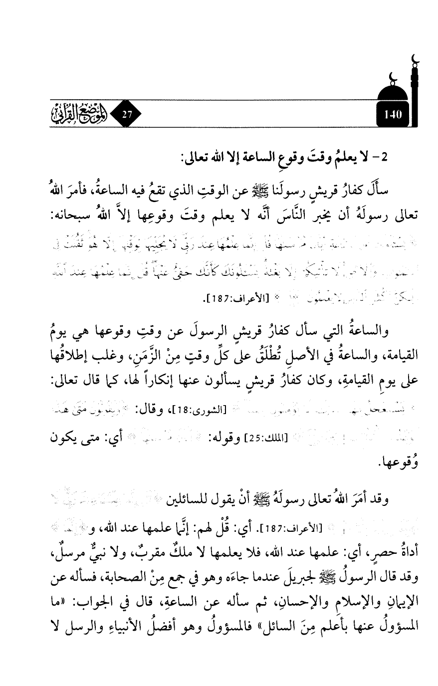 {يَسْأَلُونَكَ عَنِ السَّاعَةِ أَيَّانَ مُرْسَاهَا قُلْ إِنَّمَا عِلْمُهَا عِنْدَ رَبِّي لَا يُجلَّيهَا لِوَقْتِهَا إِلَّا هُوَ ثَقُلَتْ فِي السَّمَاوَاتِ وَالْأَرْضِ لَا تَاتِيكُمْ إِلَّا بَغْتَةً يَسْأَلُونَكَ كَأَنَّكَ حَفِيٌّ عَنْهَا قُلْ إِنَّمَا عِلْمُهَا عِنْدَ اللَّهِ وَلَكِنَّ أَكْثَرَ النَّاسِ لَا يَعْلَمُونَ} [الأعراف: 187].