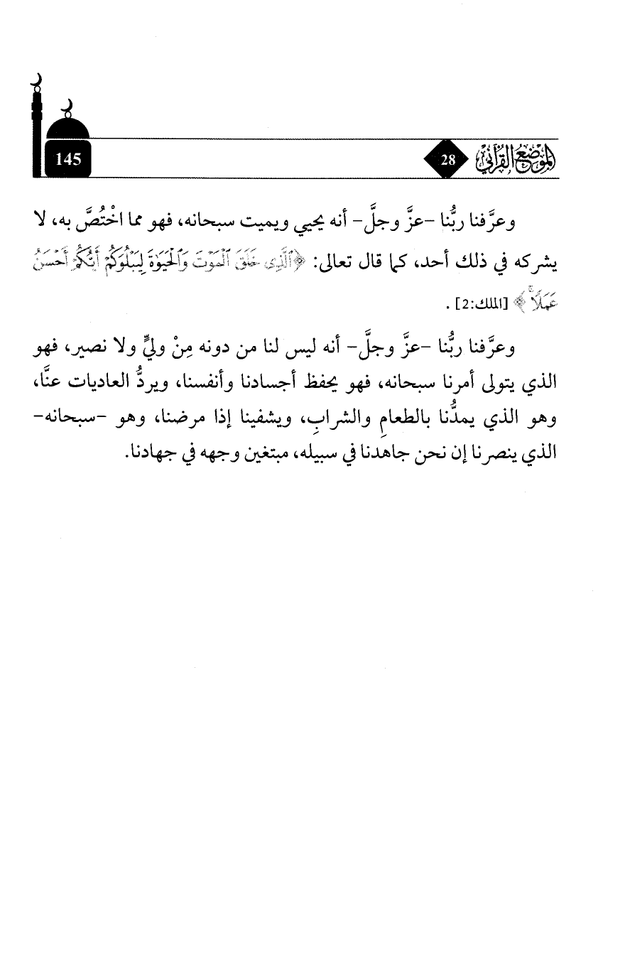 وعرَّفنا ربُّنا - عزَّ وجلَّ - أنه ليس لنا من دونه من وليٍّ ولا نصير, فهو الذي يتولى أمرنا سبحانه, فهو يحفظ أجسادنا وأنفسنا, ويردُّ العاديات عنَّا, وهو الذي يمدُّنا بالطعام والشراب, ويشفينا إذا مرضنا, وهو - سبحانه - الذي ينصرنا إن نحن جاهدنا في سبيله, مبتغين وجهه في جهادنا.