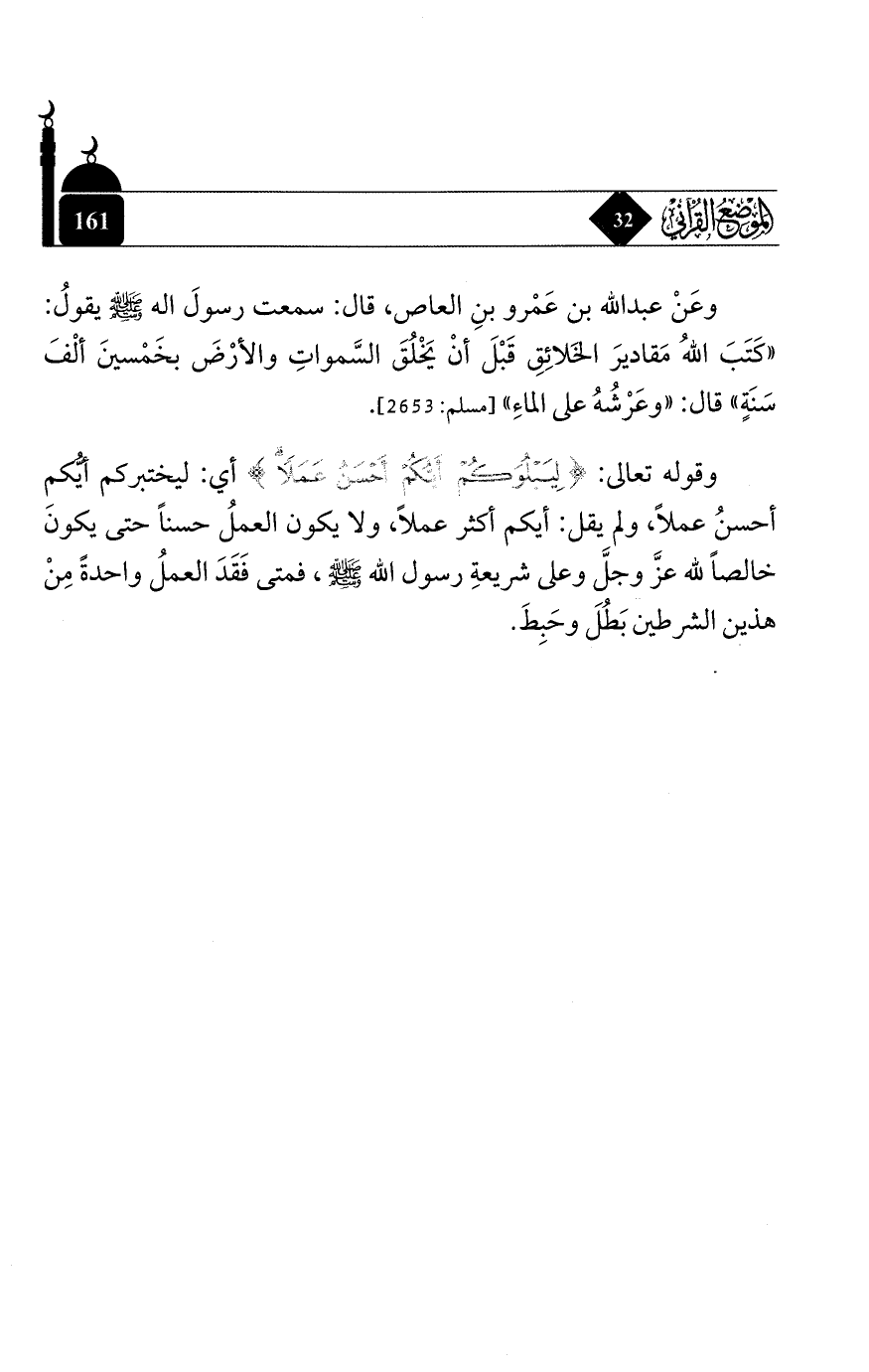 وعن عبد الله بن عمرو بن العاص، قال سمعت رسول الله - صلى الله عليه وسلم - يقول: «كتب الله مقادير الخلائق قبل أن يخلق السموات والأرض بخمسين ألف سنةٍ» وقال: «وعرشه على الماء» [مسلم: 2653].