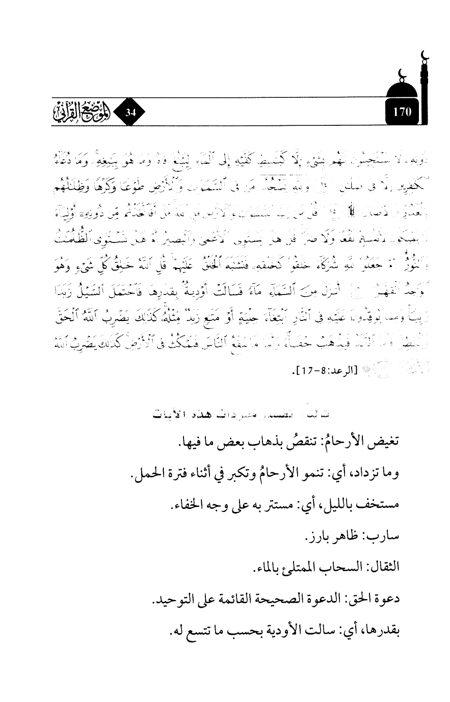 دُونِهِ لا يَسْتَجِيبُونَ لَهُم بِشَيْءٍ إلاَّ كَبَاسِطِ كَفَّيْهِ إلَى المَاءِ لِيَبْلُغَ فَاهُ ومَا هُوَ بِبَالِغِهِ ومَا دُعَاءُ الكَافِرِينَ إلاَّ فِي ضَلالٍ * ولِلَّهِ يَسْجُدُ مَن فِي السَّمَوَاتِ والأَرْضِ طَوْعًا وكَرْهًا وظِلالُهُم بِالْغُدُوِّ والآصَالِ * قُلْ مَن رَّبُّ السَّمَوَاتِ والأَرْضِ قُلِ اللَّهُ قُلْ أَفَاتَّخَذْتُم مِّن دُونِهِ أَوْلِيَاءَ لا يَمْلِكُونَ لأَنفُسِهِمْ نَفْعًا ولا ضَرًا قُلْ هَلْ يَسْتَوِي الأَعْمَى والْبَصِيرُ أَمْ هَلْ تَسْتَوِي الظُّلُمَاتُ والنُّورُ أَمْ جَعَلُوا لِلَّهِ شُرَكَاءَ خَلَقُوا كَخَلْقِهِ فَتَشَابَهَ الخَلْقُ عَلَيْهِمْ قُلِ اللَّهُ خَالِقُ كُلِّ شَيْءٍ وهُوَ الوَاحِدُ القَهَّارُ * أَنزَلَ مِنَ السَّمَاءِ مَاءً فَسَالَتْ أَوْدِيَةٌ بِقَدَرِهَا فَاحْتَمَلَ السَّيْلُ زَبَدًا رَّابِيًا ومِمَّا