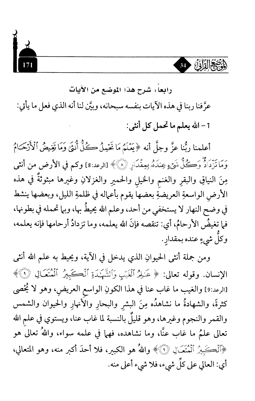 ومن جملة أنثى الحيوان الذي يدخل في الآية، ويحيط به علم الله أنثى الإنسان. وقوله تعالى: {عَالِمُ الغَيْبِ والشَّهَادَةِ الكَبِيرُ المُتَعَالِ} [الرعد: 9] والغيب ما غاب عنا في هذا الكون الواسع العريض، وهو لا يُحصى كثرة، والشهادة ما نشاهده من البشر والبحار والأنهار والحيوان والشمس والقمر والنجوم وغيرها، وهو قليلٌ بالنسبة لما غاب عنا، ويستوي في علم الله تعالى علمُ ما غاب عنَّا، وما نشاهده، فهما في علمه سواء، والله تعالى هو {الكَبِيرُ المُتَعَالِ} والله هو الكبير، فلا أحد أكبر منه، وهو المتعالي، أي: العالي على كلِّ شيء، فلا شيء أعلى منه.