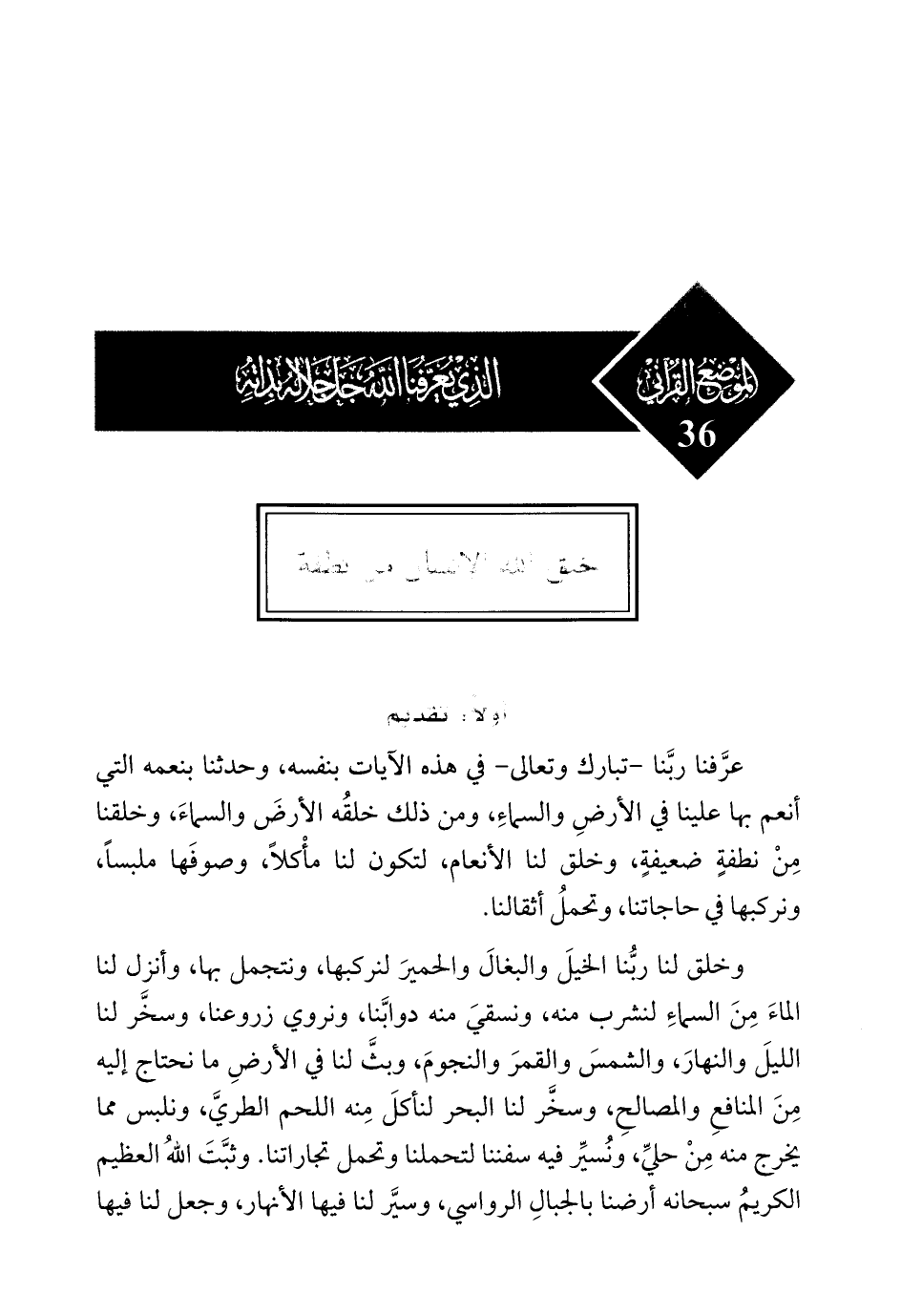 عرَّفنا ربُّنا - تبارك وتعالى - في هذه الآيات بنفسه، وحدَّثنا بنعمه التي أنعم بها علينا في الأرض والسماء، ومن ذلك خلقه الأرض والسماء، وخلقنا من نطفةٍ ضعيفةٍ، وخلق لنا الأنعام، لتكون لنا مأكلًا، وصوفها ملبسًا، ونركبها في حاجاتنا، وتحمل أثقالنا.