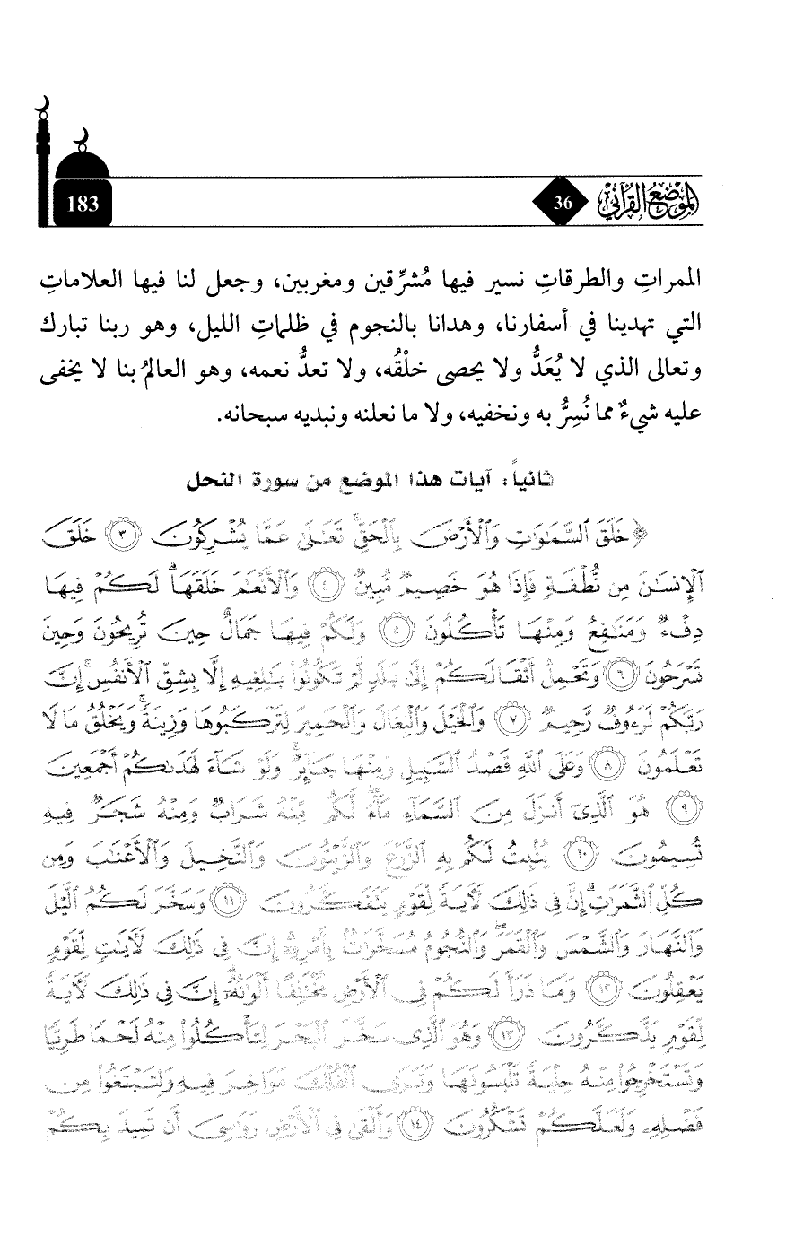 {خَلَقَ السَّمَاوَاتِ وَالْأَرْضَ بِالْحَقِّ تَعَالَى عَمَّا يُشْرِكُونَ * خَلَقَ الْإِنْسَانَ مِنْ نُطْفَةٍ فَإِذَا هُوَ خَصِيمٌ مُبِينٌ * وَالْأَنْعَامَ خَلَقَهَا لَكُمْ فِيهَا دِفْءٌ وَمَنَافِعُ وَمِنْهَا تَاكُلُونَ * وَلَكُمْ فِيهَا جَمَالٌ حِينَ تُرِيحُونَ وَحِينَ تَسْرَحُونَ * وَتَحْمِلُ أَثْقَالَكُمْ إِلَى بَلَدٍ لَمْ تَكُونُوا بَالِغِيهِ إِلَّا بِشِقِّ الْأَنْفُسِ إِنَّ رَبَّكُمْ لَرَءُوفٌ رَحِيمٌ * وَالْخَيْلَ وَالْبِغَالَ وَالْحَمِيرَ لِتَرْكَبُوهَا وَزِينَةً وَيَخْلُقُ مَا لَا تَعْلَمُونَ * وَعَلَى اللَّهِ قَصْدُ السَّبِيلِ وَمِنْهَا جَائِرٌ وَلَوْ شَاءَ لَهَدَاكُمْ أَجْمَعِينَ * هُوَ الَّذِي أَنْزَلَ مِنَ السَّمَاءِ مَاءً لَكُمْ مِنْهُ شَرَابٌ وَمِنْهُ شَجَرٌ فِيهِ تُسِيمُونَ * يُنْبِتُ لَكُمْ بِهِ الزَّرْعَ وَالزَّيْتُونَ وَالنَّخِيلَ وَالْأَعْنَابَ وَمِنْ كُلِّ الثَّمَرَاتِ إِنَّ فِي ذَلِكَ لَآَيَةً لِقَوْمٍ يَتَفَكَّرُونَ * وَسَخَّرَ لَكُمُ اللَّيْلَ وَالنَّهَارَ وَالشَّمْسَ وَالْقَمَرَ وَالنُّجُومُ مُسَخَّرَاتٌ بِأَمْرِهِ إِنَّ فِي ذَلِكَ لَآَيَاتٍ لِقَوْمٍ يَعْقِلُونَ * وَمَا ذَرَأَ لَكُمْ فِي الْأَرْضِ مُخْتَلِفًا أَلْوَانُهُ إِنَّ فِي ذَلِكَ لَآَيَةً لِقَوْمٍ يَذَّكَّرُونَ * وَهُوَ الَّذِي سَخَّرَ الْبَحْرَ لِتَاكُلُوا مِنْهُ لَحْمًا طَرِيًّا وَتَسْتَخْرِجُوا مِنْهُ حِلْيَةً تَلْبَسُونَهَا وَتَرَى الْفُلْكَ مَوَاخِرَ فِيهِ وَلِتَبْتَغُوا مِنْ فَضْلِهِ وَلَعَلَّكُمْ تَشْكُرُونَ * وَأَلْقَى فِي الْأَرْضِ رَوَاسِيَ أَنْ تَمِيدَ بِكُمْ