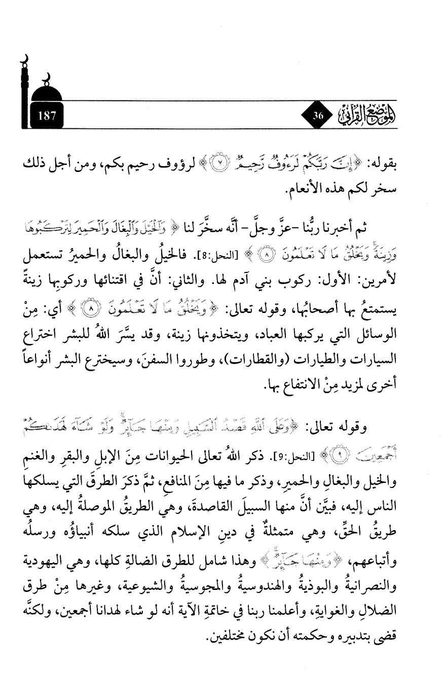 وقوله تعالى: {وَعَلَى اللَّهِ قَصْدُ السَّبِيلِ وَمِنْهَا جَائِرٌ وَلَوْ شَاءَ لَهَدَاكُمْ} [النحل: 9]. ذكر الله تعالى الحيوانات من الإبل والبقر والغنم والخيل والبغال والحمير, وذكر ما فيها من المنافع, ثمَّ ذكر الطرق التي يسلكها الناس إليه, فبيَّن أنَّ منها السبيل القاصدة, وهي الطريق الموصلة إليه, وهي طريق الحقِّ, وهي متمثلة في دين الإسلام الذي سلكه أنبياؤه ورسله وأتباعهم, {وَمِنْهَا جَآئِرٌ} وهذا شامل للطرق الضالة كلها, وهي اليهودية والنصرانية والبوذية والهندوسية والمجوسية والشيوعية, وغيرها من طرق الضلال والغواية, وأعلمنا ربُّنا في خاتمة الآية أنه لو شاء لهدانا أجمعين, ولكنَّه قضى بتدبيره وحكمته أن نكون مختلفين.