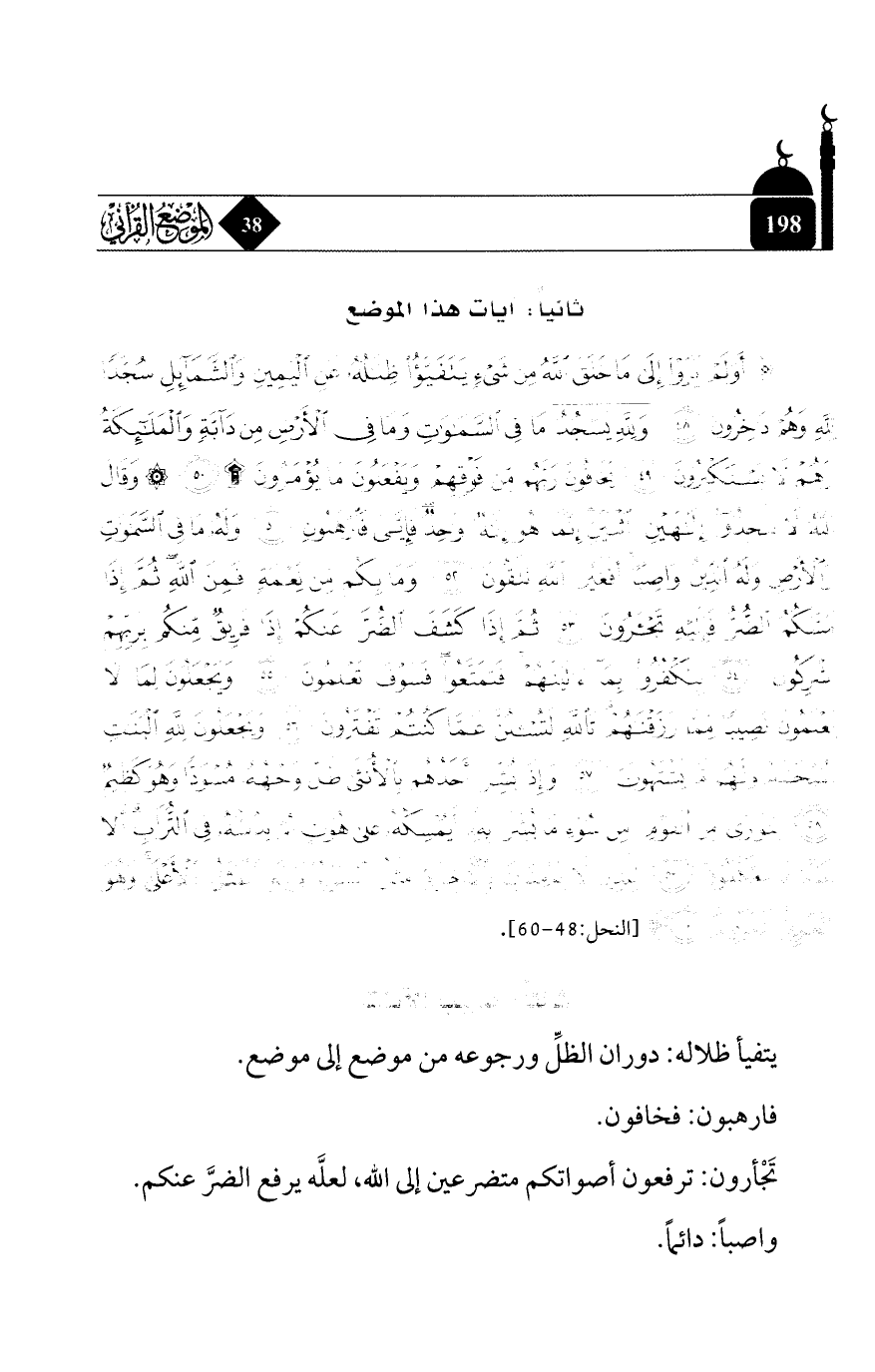 {أَوَلَمْ يَرَوْا إِلَى مَا خَلَقَ اللَّهُ مِنْ شَيْءٍ يَتَفَيَّأُ ظِلَالُهُ عَنِ الْيَمِينِ وَالشَّمَائِلِ سُجَّدًا لِلَّهِ وَهُمْ دَاخِرُونَ * وَلِلَّهِ يَسْجُدُ مَا فِي السَّمَاوَاتِ وَمَا فِي الْأَرْضِ مِنْ دَابَّةٍ وَالْمَلَائِكَةُ وَهُمْ لَا يَسْتَكْبِرُونَ * يَخَافُونَ رَبَّهُمْ مِنْ فَوْقِهِمْ وَيَفْعَلُونَ مَا يُؤْمَرُونَ * وَقَالَ اللَّهُ لَا تَتَّخِذُوا إِلَهَيْنِ اثْنَيْنِ إِنَّمَا هُوَ إِلَهٌ وَاحِدٌ فَإِيَّايَ فَارْهَبُونِ * وَلَهُ مَا فِي السَّمَاوَاتِ وَالْأَرْضِ وَلَهُ الدِّينُ وَاصِبًا أَفَغَيْرَ اللَّهِ تَتَّقُونَ * وَمَا بِكُمْ مِنْ نِعْمَةٍ فَمِنَ اللَّهِ ثُمَّ إِذَا مَسَّكُمُ الضُّرُّ فَإِلَيْهِ تَجْأَرُونَ * ثُمَّ إِذَا كَشَفَ الضُّرَّ عَنْكُمْ إِذَا فَرِيقٌ مِنْكُمْ بِرَبِّهِمْ يُشْرِكُونَ * لِيَكْفُرُوا بِمَا آَتَيْنَاهُمْ فَتَمَتَّعُوا فَسَوْفَ تَعْلَمُونَ * وَيَجْعَلُونَ لِمَا لَا يَعْلَمُونَ نَصِيبًا مِمَّا رَزَقْنَاهُمْ تَاللَّهِ لَتُسْأَلُنَّ عَمَّا كُنْتُمْ تَفْتَرُونَ * وَيَجْعَلُونَ لِلَّهِ الْبَنَاتِ سُبْحَانَهُ وَلَهُمْ مَا يَشْتَهُونَ * وَإِذَا بُشِّرَ أَحَدُهُمْ بِالْأُنْثَى ظَلَّ وَجْهُهُ مُسْوَدًّا وَهُوَ كَظِيمٌ * يَتَوَارَى مِنَ الْقَوْمِ مِنْ سُوءِ مَا بُشِّرَ بِهِ أَيُمْسِكُهُ عَلَى هُونٍ أَمْ يَدُسُّهُ فِي التُّرَابِ أَلَا سَاءَ مَا يَحْكُمُونَ * لِلَّذِينَ لَا يُؤْمِنُونَ بِالْآَخِرَةِ مَثَلُ السَّوْءِ وَلِلَّهِ الْمَثَلُ الْأَعْلَى وَهُوَ الْعزَّيزُ الْحَكِيمُ} [النحل: 48 - 60].