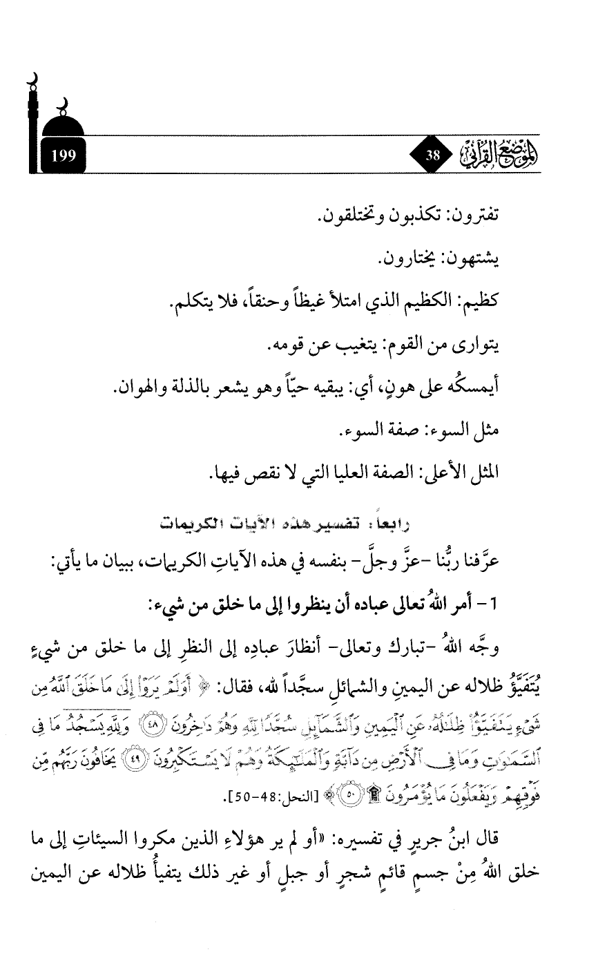 وجَّه الله - تبارك وتعالى - أنظار عباده إلى النظر إلى ما خلق من شيءٍ يُتفيَّؤ ظلاله عن اليمين والشمائل سجَّداً لله, فقال: {أَوَلَمْ يَرَوْا إِلَى مَا خَلَقَ اللَّهُ مِنْ شَيْءٍ يَتَفَيَّأُ ظِلَالُهُ عَنِ الْيَمِينِ وَالشَّمَائِلِ سُجَّدًا لِلَّهِ وَهُمْ دَاخِرُونَ * وَلِلَّهِ يَسْجُدُ مَا فِي السَّمَاوَاتِ وَمَا فِي الْأَرْضِ مِنْ دَابَّةٍ وَالْمَلَائِكَةُ وَهُمْ لَا يَسْتَكْبِرُونَ * يَخَافُونَ رَبَّهُمْ مِنْ فَوْقِهِمْ وَيَفْعَلُونَ مَا يُؤْمَرُونَ} [النحل: 48 - 50].