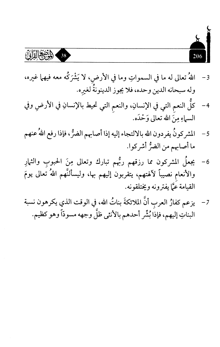 7 - يزعم كفار العرب أنَّ الملائكة بنات الله, في الوقت الذي يكرهون نسبة البنات إليهم, فإذا بشِّر أحدهم بالأنثى ظلَّ وجهه مسوداً وهو كظيم.