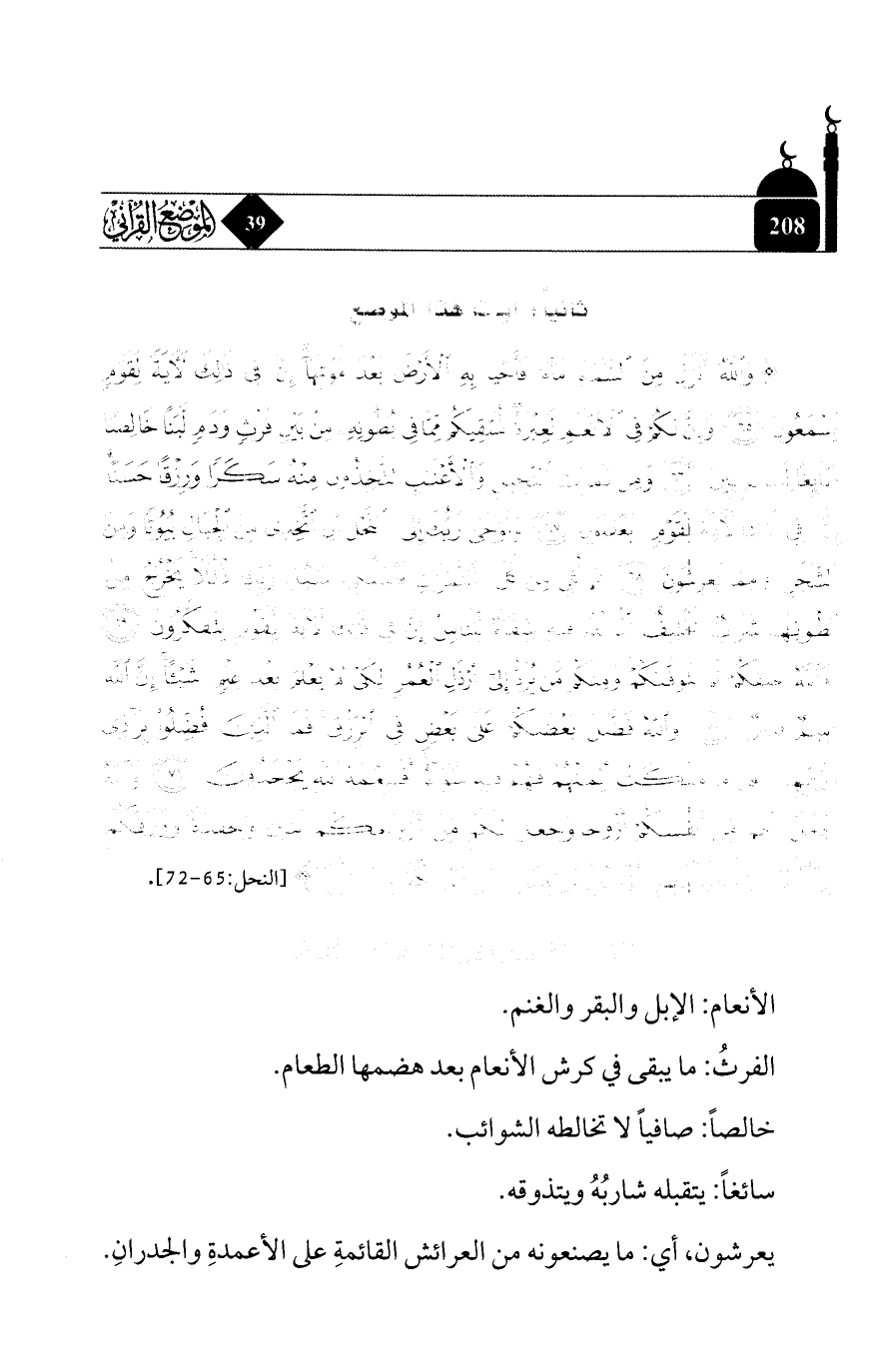 {وَاللَّهُ أَنْزَلَ مِنَ السَّمَاءِ مَاءً فَأَحْيَا بِهِ الْأَرْضَ بَعْدَ مَوْتِهَا إِنَّ فِي ذَلِكَ لَآَيَةً لِقَوْمٍ يَسْمَعُونَ * وَإِنَّ لَكُمْ فِي الْأَنْعَامِ لَعِبْرَةً نُسْقِيكُمْ مِمَّا فِي بُطُونِهِ مِنْ بَيْنِ فَرْثٍ وَدَمٍ لَبَنًا خَالِصًا سَائِغًا لِلشَّارِبِينَ * وَمِنْ ثَمَرَاتِ النَّخِيلِ وَالْأَعْنَابِ تَتَّخِذُونَ مِنْهُ سَكَرًا وَرِزْقًا حَسَنًا إِنَّ فِي ذَلِكَ لَآَيَةً لِقَوْمٍ يَعْقِلُونَ * وَأَوْحَى رَبُّكَ إِلَى النَّحْلِ أَنِ اتَّخِذِي مِنَ الْجِبَالِ بُيُوتًا وَمِنَ الشَّجَرِ وَمِمَّا يَعْرِشُونَ * ثُمَّ كُلِي مِنْ كُلِّ الثَّمَرَاتِ فَاسْلُكِي سُبُلَ رَبِّكِ ذُلُلًا يَخْرُجُ مِنْ بُطُونِهَا شَرَابٌ مُخْتَلِفٌ أَلْوَانُهُ فِيهِ شِفَاءٌ لِلنَّاسِ إِنَّ فِي ذَلِكَ لَآَيَةً لِقَوْمٍ يَتَفَكَّرُونَ * وَاللَّهُ خَلَقَكُمْ ثُمَّ يَتَوَفَّاكُمْ وَمِنْكُمْ مَنْ يُرَدُّ إِلَى أَرْذَلِ الْعُمُرِ لِكَيْ لَا يَعْلَمَ بَعْدَ عِلْمٍ شَيْئًا إِنَّ اللَّهَ عَلِيمٌ قَدِيرٌ * وَاللَّهُ فَضَّلَ بَعْضَكُمْ عَلَى بَعْضٍ فِي الرِّزْقِ فَمَا الَّذِينَ فُضِّلُوا بِرَادِّي رِزْقِهِمْ عَلَى مَا مَلَكَتْ أَيْمَانُهُمْ فَهُمْ فِيهِ سَوَاءٌ أَفَبِنِعْمَةِ اللَّهِ يَجْحَدُونَ * وَاللَّهُ جَعَلَ لَكُمْ مِنْ أَنْفُسِكُمْ أَزْوَاجًا وَجَعَلَ لَكُمْ مِنْ أَزْوَاجِكُمْ بَنِينَ وَحَفَدَةً وَرَزَقَكُمْ مِنَ الطَّيِّبَاتِ أَفَبِالْبَاطِلِ يُؤْمِنُونَ وَبِنِعْمَةِ اللَّهِ هُمْ يَكْفُرُونَ} [النحل: 65 - 72].