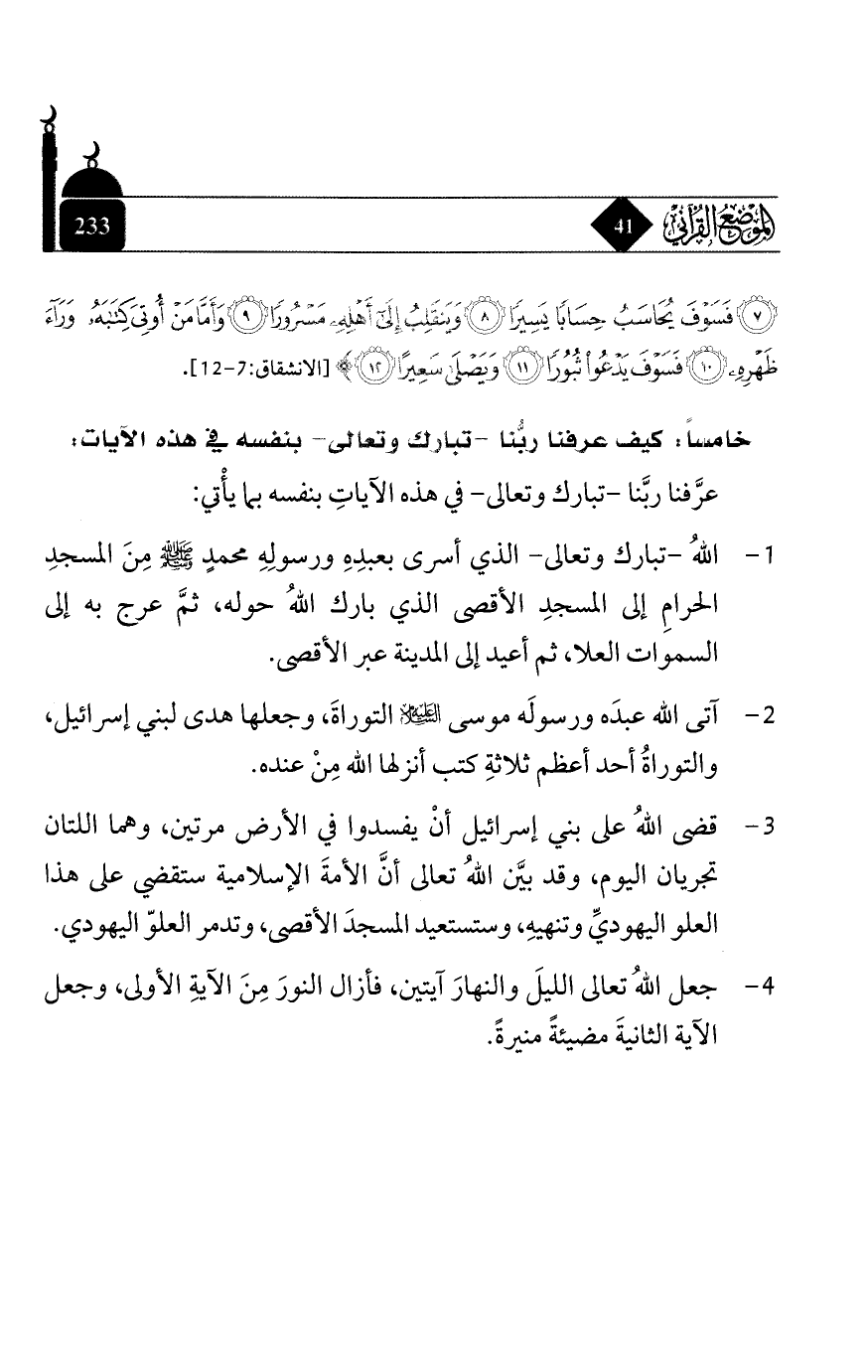 3 - قضى الله على بني إسرائيل أن يفسدوا في الأرض مرتين , وهما اللتان تجريان اليوم , وقد بيَّن الله تعالى أنَّ الأمة الإسلامية ستقضي على هذا العلو اليهوديِّ وتنهيه , وستستعيد المسجد الأقصى , وتدمر العلو اليهودي.
