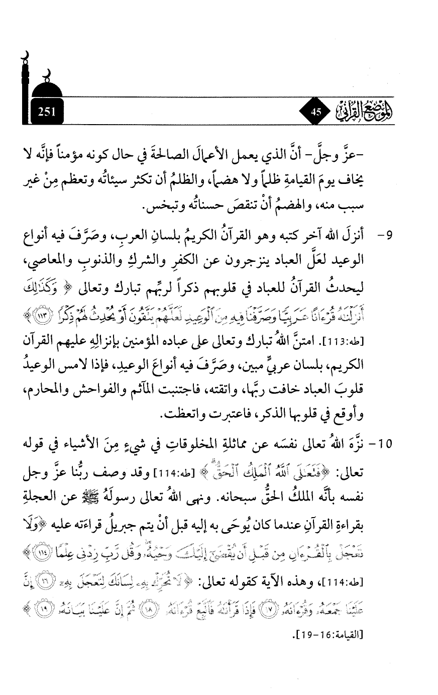 10 - نزَّه الله تعالى نفسه عن مماثلة المخلوقات في شيءٍ من الأشياء في قوله تعالى: {فَتَعَالَى اللَّهُ الْمَلِكُ الْحَقُّ} [طه: 114] وقد وصف ربُّنا عزَّ وجلَّ نفسه بأنَّه الملك الحقُّ سبحانه. ونهى الله تعالى رسوله - صلى الله عليه وسلم - عن العجلة بقراءة القرآن عندما كان يوحى به إليه قبل أن يتم جبريل قراءته عليه {وَلَا تَعْجلَّ بِالْقُرْآَنِ مِنْ قَبْلِ أَنْ يُقْضَى إِلَيْكَ وَحْيُهُ وَقُلْ رَبِّ زِدْنِي عِلْمًا} [طه: 114]، وهذه الآية كقوله تعالى: {لَا تُحَرِّكْ بِهِ لِسَانَكَ لِتَعْجلَّ بِهِ * إِنَّ عَلَيْنَا جَمْعَهُ وَقُرْآَنَهُ * فَإِذَا قَرَانَاهُ فَاتَّبِعْ قُرْآَنَهُ * ثُمَّ إِنَّ عَلَيْنَا بَيَانَهُ} [القيامة: 16 - 19].