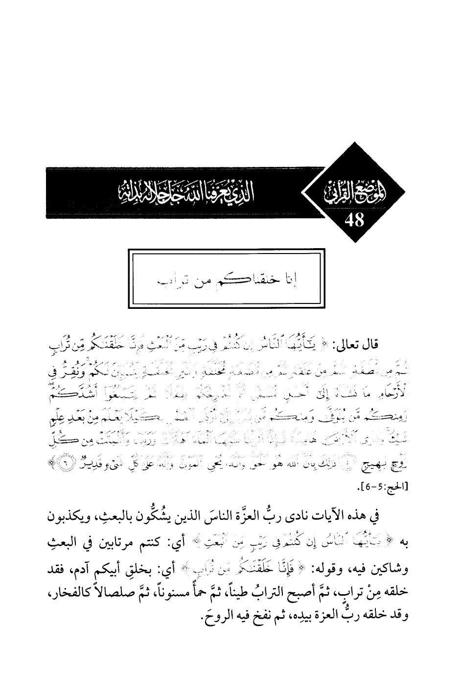 في هذه الآيات نادى ربُّ العزَّة الناس الذين يشكُّون بالبعث، ويكذبون به {يَا أَيُّهَا النَّاسُ إِنْ كُنْتُمْ فِي رَيْبٍ مِنَ الْبَعْثِ} أي: كنتم مرتابين في البعث وشاكين فيه، وقوله: {فَإِنَّا خَلَقْنَاكُمْ مِنْ تُرَابٍ} أي: بخلق أبيكم آدم، فقد خلقه من تراب، ثمَّ أصبح التراب طيناً، ثمَّ حمأً مسنوناً، ثمَّ صلصالاً كالفخار، وقد خلقه ربُّ العزَّة بيده، ثم نفخ فيه الروح.