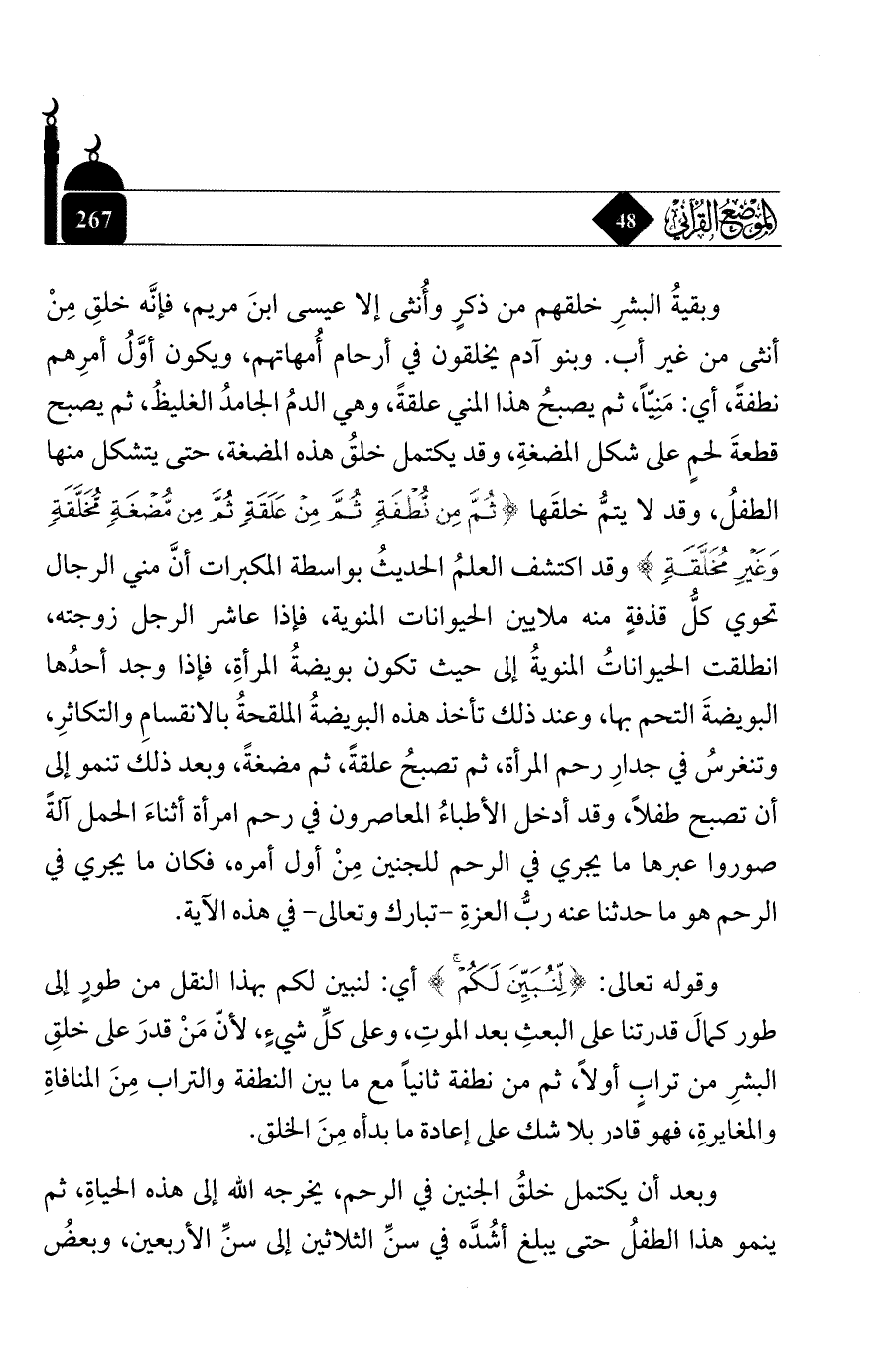وبقية البشر خلقهم من ذكرٍ وأنثى إلا عيسى ابن مريم، فإنَّه خلق من أنثى من غير أب. وبنو آدم يخلقون في أرحام أمهاتهم، ويكون أوَّل أمرهم نطفة، أي: منياً، ثم يصبح هذا المني علقةً، وهي الدم الجامد الغليظ، ثم يصبح قطعة لحمٍ على شكل المضغة، وقد يكتمل خلق هذه المضغة، حتى يتشكل منها الطفل، وقد لا يتمُّ خلقها {ثُمَّ مِنْ نُطْفَةٍ ثُمَّ مِنْ عَلَقَةٍ ثُمَّ مِنْ مُضْغَةٍ مُخَلَّقَةٍ} وقد اكتشف العلم الحديث بواسطة المكبرات أنَّ مني الرجال تحوي كلُّ قذفة منه ملايين الحيوانات المنوية، فإذا عاشر الرجل زوجته، انطلقت الحيوانات المنوية إلى حيث تكون بويضة المرأة، فإذا وجد أحدها البويضة التحم بها، وعند ذلك تأخذ هذه البويضة الملقحة بالانقسام والتكاثر، وتنغرس في جدار رحم المرأة، ثم تصبح علقةً، ثم مضغةً، وبعد ذلك تنمو إلى أن تصبح طفلاً، وقد أدخل الأطباء المعاصرون في رحم امرأة أثناء الحمل آلةً صوروا عبرها ما يجري في الرحم للجنين من أول أمره، فكان ما يجري في الرحم هو ما حدثنا عنه ربُّ العزَّة - تبارك وتعالى - في هذه الآية.