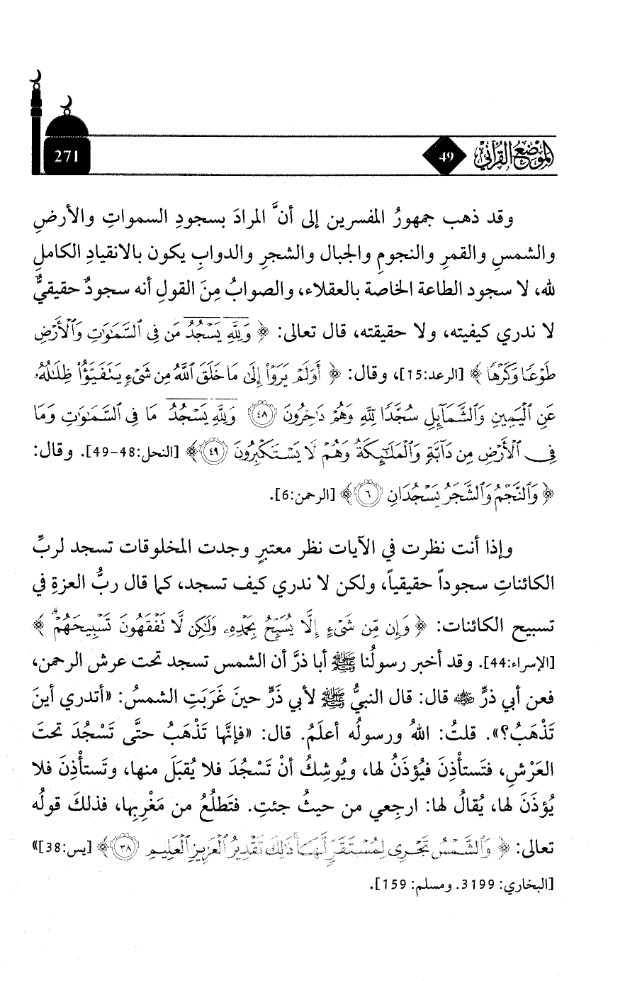 وإذا أنت نظرت في الآيات نظر معتبرٍ وجدت المخلوقات تسجد لربِّ الكائنات سجوداً حقيقياً، ولكن لا ندري كيف تسجد، كما قال ربُّ العزَّة في تسبيح الكائنات: {وَإِنْ مِنْ شَيْءٍ إِلَّا يُسَبِّحُ بِحَمْدِهِ وَلَكِنْ لَا تَفْقَهُونَ تَسْبِيحَهُمْ} [الإسراء: 44] وقد أخبر رسولنا - صلى الله عليه وسلم - أبا ذر أن الشمس تسجد تحت عرش الرحمن، فعن أبي ذرٍّ - رضي الله عنه - قال: قال النبي - صلى الله عليه وسلم - لأبي ذرٍّ حين غربت الشمس: «أتدري أين تذهب؟». قلت: الله ورسوله أعلم. قال: «فإنَّها تذهب حتَّى تسجد تحت العرش، فتستأذن فيؤذن لها، ويوشك أن تسجد فلا يقبل منها، وتستأذن فلا يؤذن لها، فيقال لها: ارجعي من حيث جئت. فتطلع من مغربها، فذلك قوله تعالى: {وَالشَّمْسُ تَجْرِي لِمُسْتَقَرٍّ لَهَا ذَلِكَ تَقْدِيرُ الْعزَّيزِ الْعَلِيمِ} [يس: 38]» [البخاري: 3199. ومسلم: 159].