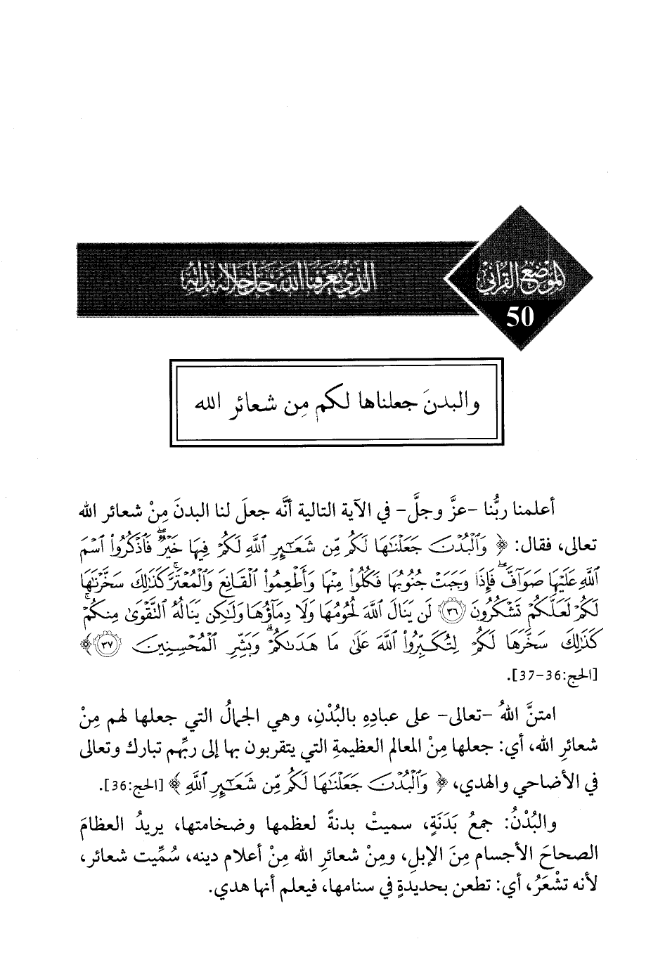 أعلمنا ربُّنا - عزَّ وجلَّ - في الآية التالية أنَّه جعل لنا البدن من شعائر الله تعالى، فقال: {وَالْبُدْنَ جَعَلْنَاهَا لَكُمْ مِنْ شَعَائِرِ اللَّهِ لَكُمْ فِيهَا خَيْرٌ فَاذْكُرُوا اسْمَ اللَّهِ عَلَيْهَا صَوَافَّ فَإِذَا وَجَبَتْ جُنُوبُهَا فَكُلُوا مِنْهَا وَأَطْعِمُوا الْقَانِعَ وَالْمُعْتَرَّ كَذَلِكَ سَخَّرْنَاهَا لَكُمْ لَعَلَّكُمْ تَشْكُرُونَ * لَنْ يَنَالَ اللَّهَ لُحُومُهَا وَلَا دِمَاؤُهَا وَلَكِنْ يَنَالُهُ التَّقْوَى مِنْكُمْ كَذَلِكَ سَخَّرَهَا لَكُمْ لِتُكَبِّرُوا اللَّهَ عَلَى مَا هَدَاكُمْ وَبَشِّرِ الْمُحْسِنِينَ} [الحج: 36 - 37].