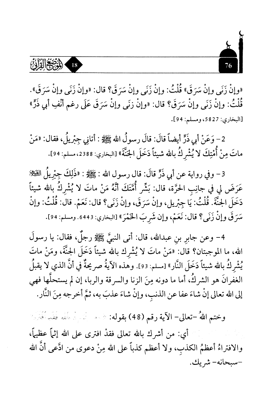 2 - وعن أبي ذرٍّ أيضًا قال: قال رسول الله - صلى الله عليه وسلم -: أتاني جبريل، فقال: «من مات من أمتك لا يشرك بالله شيئًا دخل الجنَّة» [البخاري: 2388، مسلم: 94].