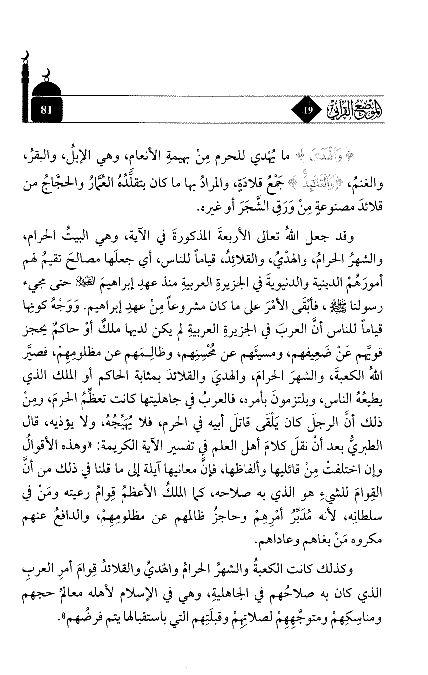 وكذلك كانت الكعبة والشهر الحرام والهدي والقلائد قوام أمر العرب الذي كان به صلاحهم في الجاهلية، وهي في الإسلام لأهله معالم حجهم ومناسكهم ومتوجَّهِهِم لصلاتهم وقبلتهم التي باستقبالها يتم فرضهم».