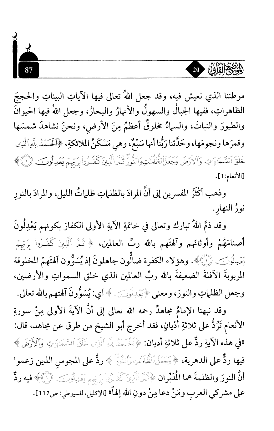 وقد نبهنا الإمام مجاهدٌ رحمه الله تعالى إلى أنَّ الآية الأولى من سورة الأنعام تردٌّ على ثلاثة أديانٍ، فقد أخرج أبو الشيخ من طرق عن مجاهد، قال: «في هذه الآية ردٌّ على ثلاثة أديان: {الْحَمْدُ لِلَّهِ الَّذِي خَلَقَ السَّمَاوَاتِ وَالْأَرْضَ} فيها ردٌّ على الدهرية، {وَجَعَلَ الظُّلُمَاتِ وَالنُّور} ردٌّ على المجوس الذين زعموا أنَّ النور والظلمة هما المدبِّران {ثُمَّ الَّذِينَ كَفَرُوا بِرَبِّهِمْ يَعْدِلُونَ} فيه ردٌّ على مشركي العرب ومن دعا من دون الله إلهًا» [الإكليل، للسيوطي: ص 117].