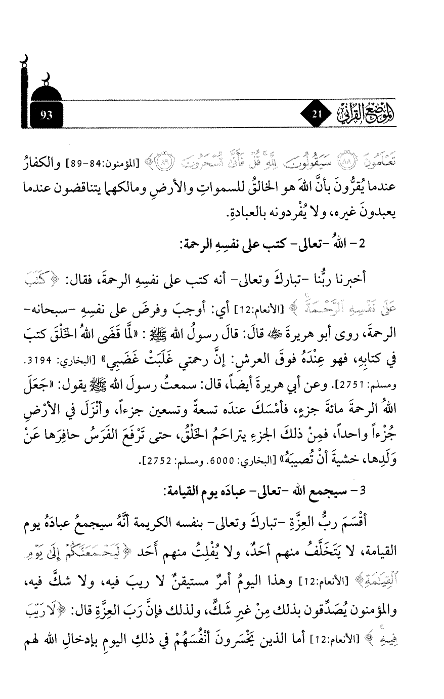 أخبرنا ربُّنا - تبارك وتعالى - أنه كتب على نفسه الرحمة، فقال: {كَتَبَ عَلَى نَفْسِهِ الرَّحْمَةَ} [الأنعام: 12] أي: أوجب وفرض على نفسِهِ - سبحانه - الرحمة، روي أبو هريرة - رضي الله عنه - قال: قال رسول الله - صلى الله عليه وسلم -: «لمَّا قضى الله الخلق كتب كتابه، فهو عنده فوق العرش: إنَّ رحمتي غلبت غضبي» [البخاري: 3194. ومسلم: 2751]. وعن أبي هريرة أيضًا، قال: سمعت رسول الله - صلى الله عليه وسلم - يقول: «جعل الله الرحمة مائة جزءٍ، فأمسك عند تسعةً وتسعين جزءًا، وأنزل في الأرض جزءاً واحدًا، فمن ذلك الجزء يتراحم الخلق، حتى ترفع الفرس حافرها عن ولدها، خشية أن تصيبه» [البخاري: 6000. ومسلم: 2752].