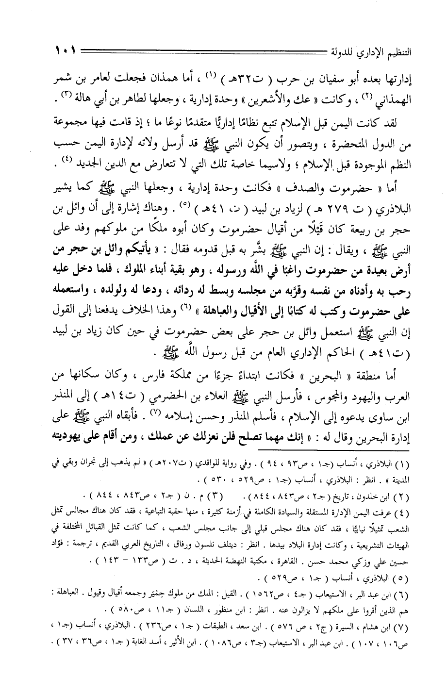 أما «حضرموت والصدف» فكانت واحدة إدارية، وجعلها النبي صلّى الله عليه وسلم كما يشير البلاذري (ت 279 هـ) لزياد بن لبيد (ت 41 هـ) «5» . وهناك إشارة إلى أن وائل بن حجر بن ربيعة كان قيلا من أقيال حضرموت وكان أبوه ملكا من ملوكهم وفد على النبي صلّى الله عليه وسلم، ويقال: إن النبي صلّى الله عليه وسلم بشّر به قبل قدومه فقال: «يأتيكم وائل بن حجر من أرض بعيدة من حضرموت راغبا في الله ورسوله، وهو بقية أبناء الملوك، فلما دخل عليه رحب به وأدناه من نفسه وقرّبه من مجلسه وبسط له ردائه، ودعا له ولولده، واستعمله على حضرموت وكتب له كتابا إلى الأقيال والعباهلة» «6» وهذا الخلاف يدفعنا إلى القول إن النبي صلّى الله عليه وسلم استعمل وائل بن حجر على بعض حضرموت في حين كان زياد بن لبيد (ت 41 هـ) الحاكم الإداري العام من قبل رسول الله صلّى الله عليه وسلم.
