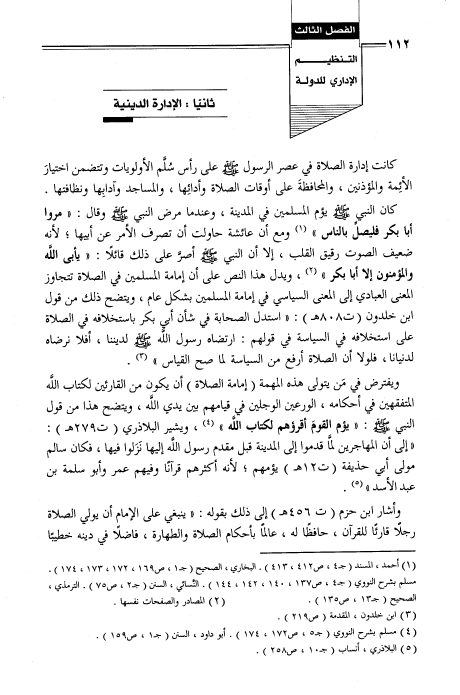 ويفترض في من يتولى هذه المهمة (إمامة الصلاة) أن يكون من القارئين لكتاب الله المتفقهين في أحكامه، الورعين الوجلين في قيامهم بين يدي الله، ويتضح هذا من قول النبي صلّى الله عليه وسلم: «يؤم القوم أقرؤهم لكتاب الله» «4» ، ويشير البلاذري (ت 279 هـ) :