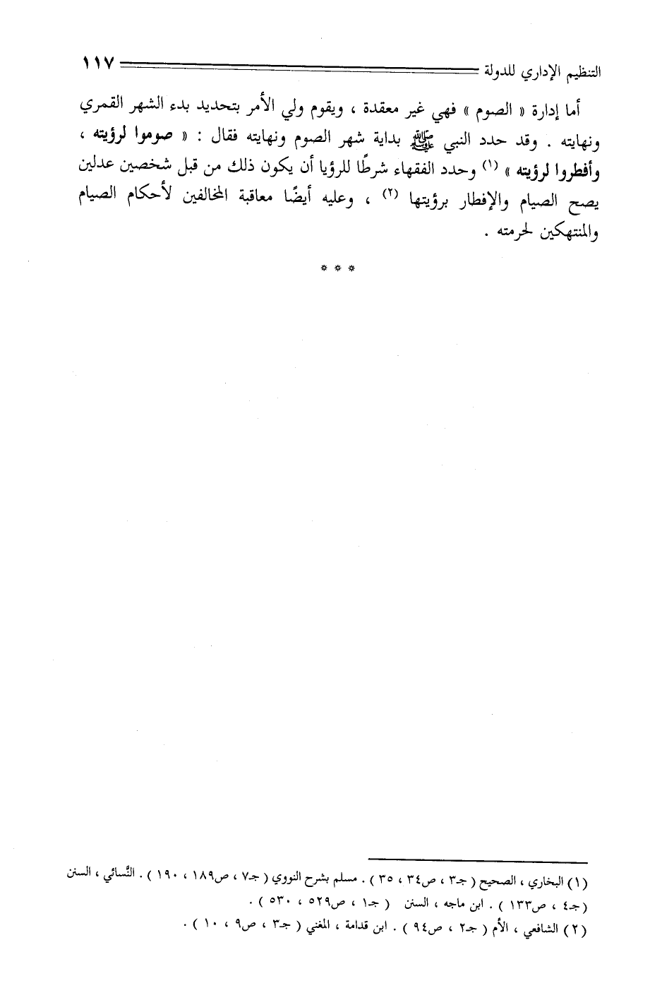 أما إدارة «الصوم» فهي غير معقدة، ويقوم ولي الأمر بتحديد بدء الشهر القمري ونهايته. وقد حدد النبي صلّى الله عليه وسلم بداية شهر الصوم ونهايته فقال: «صوموا لرؤيته، وأفطروا لرؤيته» «1» وحدد الفقهاء شرطا للرؤيا أن يكون ذلك من قبل شخصين عدلين يصح الصيام والإفطار برؤيتها «2» ، وعليه أيضا معاقبة المخالفين لأحكام الصيام والمنتهكين لحرمته.