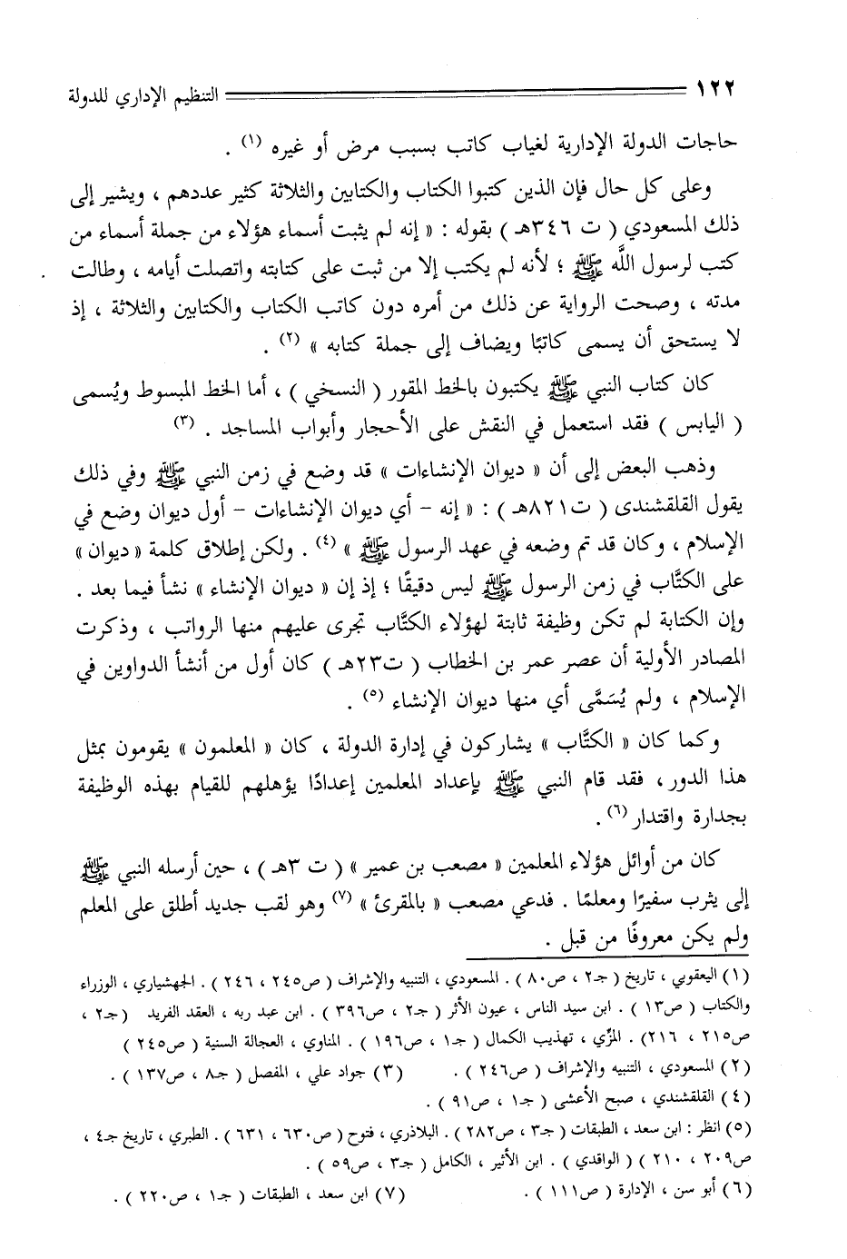 وذهب البعض إلى أن «ديوان الإنشاات» قد وضع في زمن النبي صلّى الله عليه وسلم وفي ذلك يقول القلقشندى (ت 821 هـ) : «إنه- أي ديوان الإنشاات- أول ديوان وضع في الإسلام، وكان قد تم وضعه في عهد الرسول صلّى الله عليه وسلم» «4» . ولكن إطلاق كلمة «ديوان» على الكتّاب في زمن الرسول صلّى الله عليه وسلم ليس دقيقا؛ إذ إن «ديوان الإنشاء» نشأ فيما بعد.