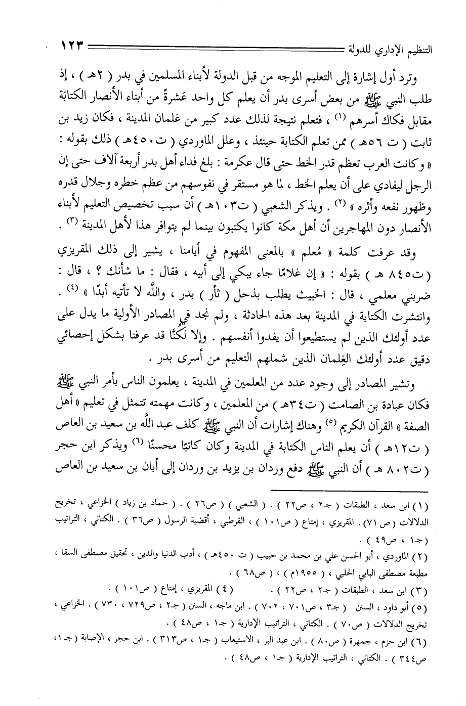 وترد أول إشارة إلى التعليم الموجه من قبل الدولة لأبناء المسلمين في بدر (2 هـ) ، إذ طلب النبي صلّى الله عليه وسلم من بعض أسرى بدر أن يعلم كل واحد عشرة من أبناء الأنصار الكتابة مقابل فكاك أسرهم «1» ، فتعلم نتيجة لذلك عدد كبير من غلمان المدينة، فكان زيد بن ثابت (ت 56 هـ) ممن تعلم الكتابة حينئذ، وعلل الماوردي (ت 450 هـ) ذلك بقوله: