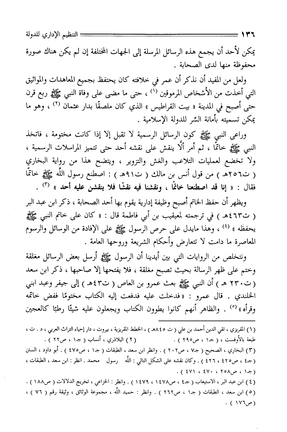 ولعل من المفيد أن نذكر أن عمر في خلافته كان يحتفظ بجميع المعاهدات والمواثيق التي أخذت من الأشخاص المرموقين «1» ، حتى ما مضى على وفاة النبي صلّى الله عليه وسلم ربع قرن حتى أصبح في المدينة «بيت القراطيس» الذي كان ملصقا بدار عثمان»