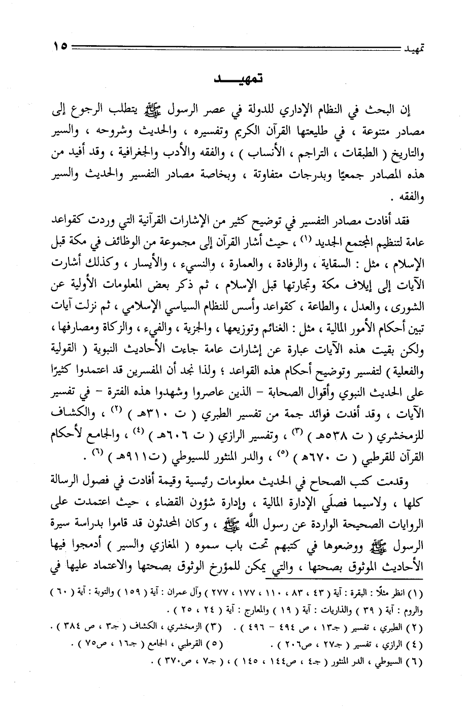 فقد أفادت مصادر التفسير في توضيح كثير من الإشارات القرانية التي وردت كقواعد عامة لتنظيم المجتمع الجديد «1» ، حيث أشار القران إلى مجموعة من الوظائف في مكة قبل الإسلام، مثل: السقاية، والرفادة، والعمارة، والنسيء، والأيسار، وكذلك أشارت الايات إلى إيلاف مكة وتجارتها قبل الإسلام، ثم ذكر بعض المعلومات الأولية عن الشورى، والعدل، والطاعة، كقواعد وأسس للنظام السياسي الإسلامي، ثم نزلت ايات تبين أحكام الأمور المالية، مثل: الغنائم وتوزيعها، والجزية، والفيء، والزكاة ومصارفها، ولكن بقيت هذه الايات عبارة عن إشارات عامة جاءت الأحاديث النبوية (القولية والفعلية) لتفسير وتوضيح أحكام هذه القواعد؛ ولذا نجد أن المفسرين قد اعتمدوا كثيرا على الحديث النبوي وأقوال الصحابة- الذين عاصروا وشهدوا هذه الفترة- في تفسير الايات، وقد أفدت فوائد جمة من تفسير الطبري (ت 310 هـ) «2» ، والكشاف للزمخشري (ت 538 هـ) «3» ، وتفسير الرازي (ت 606 هـ) «4» ، والجامع لأحكام القران للقرطبي (ت 670 هـ) «5» ، والدر المنثور للسيوطي (ت 911 هـ) «6» .