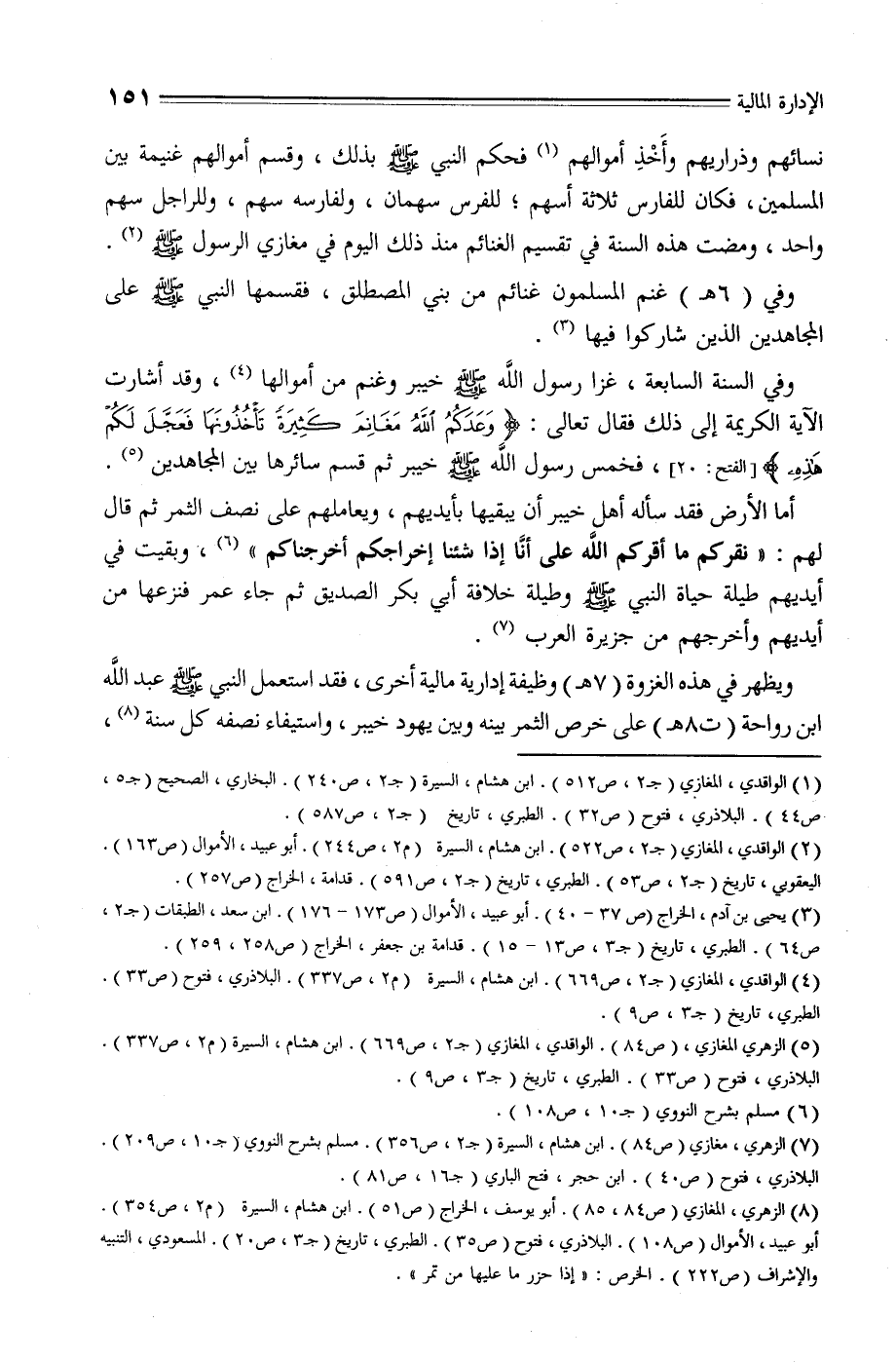 (8) الزهري، المغازي (ص 84، 85) . أبو يوسف، الخراج (ص 51) . ابن هشام، السيرة (م 2، ص 354) . أبو عبيد، الأموال (ص 108) . البلاذري، فتوح (ص 35) . الطبري، تاريخ (ج 3، ص 20) . المسعودي، التنبيه والإشراف (ص 222) . الخرص: «إذا حزر ما عليها من تمر» .