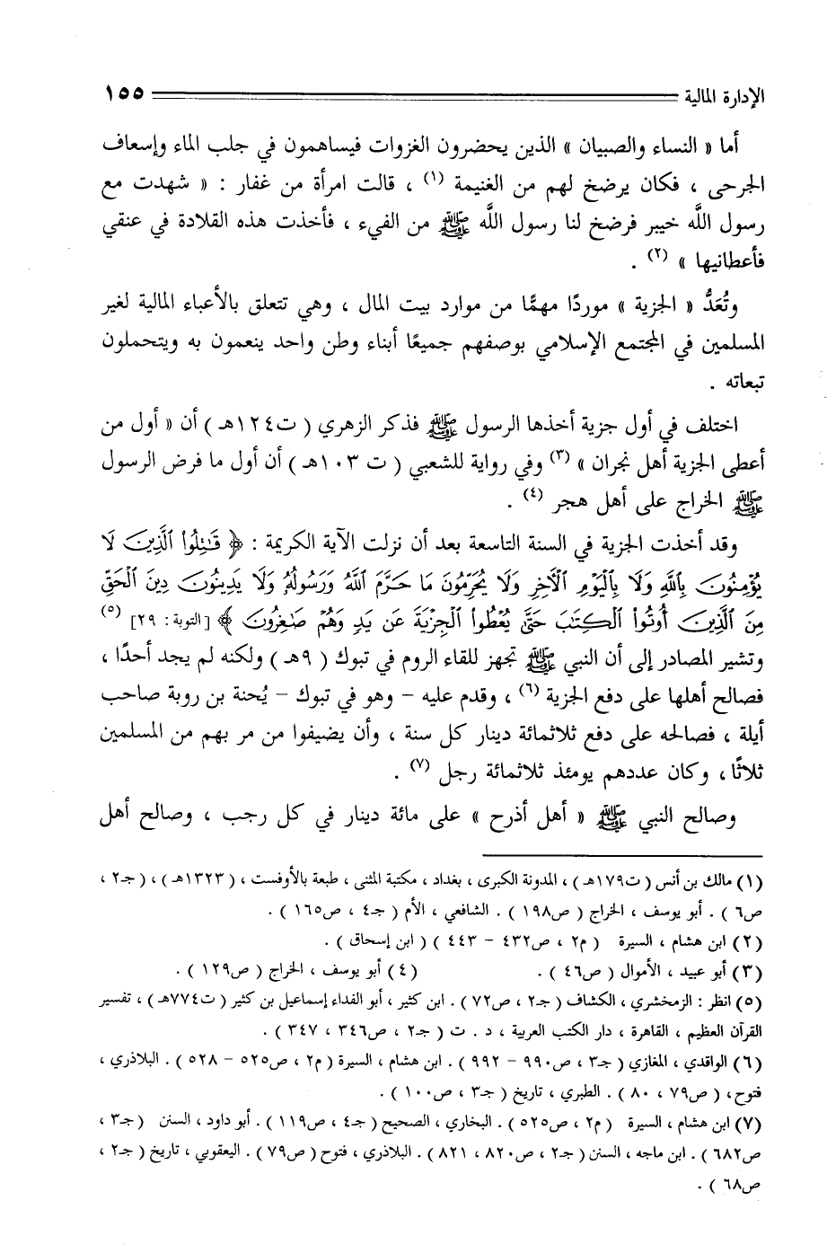 (1) مالك بن أنس (ت 179 هـ) ، المدونة الكبرى، بغداد، مكتبة المثنى، طبعة بالأوفست، (1323 هـ) ، (ج 2، ص 6) . أبو يوسف، الخراج (ص 198) . الشافعي، الأم (ج 4، ص 165) .