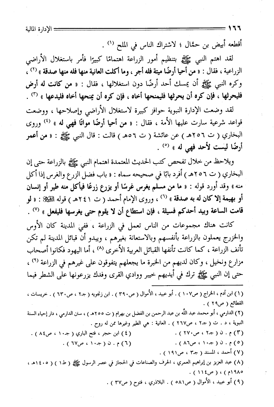 لقد وضعت الإدارة النبوية حوافز كبيرة لاستغلال الأراضي وإصلاحها، ووضعت قواعد شرعية سارت عليها الأمة، فقال: «من أحيا أرضا مواتا فهي له» «4» وروى البخاري (ت 256 هـ) عن عائشة (ت 56 هـ) قالت: قال النبي صلّى الله عليه وسلم: «من أعمر أرضا ليست لأحد فهي له» «5» .