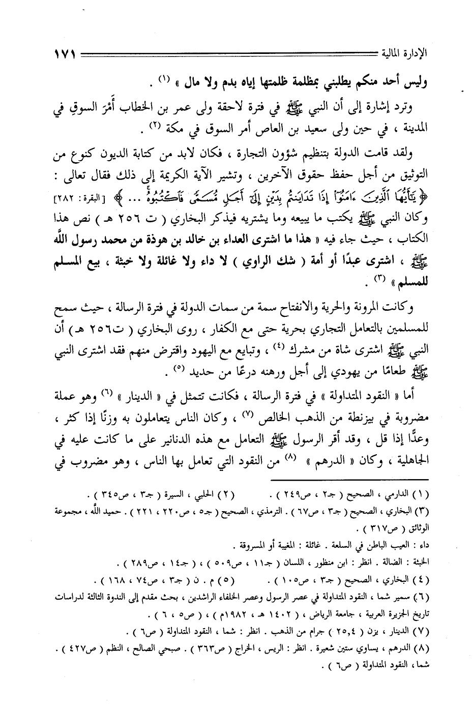 (3) البخاري، الصحيح (ج 3، ص 67) . الترمذي، الصحيح (ج 5، ص 220، 221) . حميد الله، مجموعة الوثائق (ص 317) . داء: العيب الباطن في السلعة. غائلة: المغيبة أو المسروقة. الخبثة: الضالة. انظر: ابن منظور، اللسان (ج 11، ص 509) ، (ج 14، ص 289) .