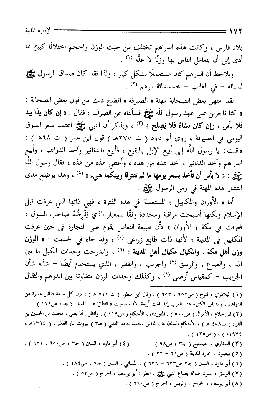 «كنا تاجرين على عهد رسول الله صلّى الله عليه وسلم فسألناه عن الصرف، فقال: «إن كان يدا بيد فلا بأس، وإن كان نسّاء فلا يصلح» «3» ، ويذكر أن النبي صلّى الله عليه وسلم اعتمد سعر السوق اليومي في الصيرفة، روى أبو داود (ت 275 هـ) قول ابن عمر (ت 68 هـ) :