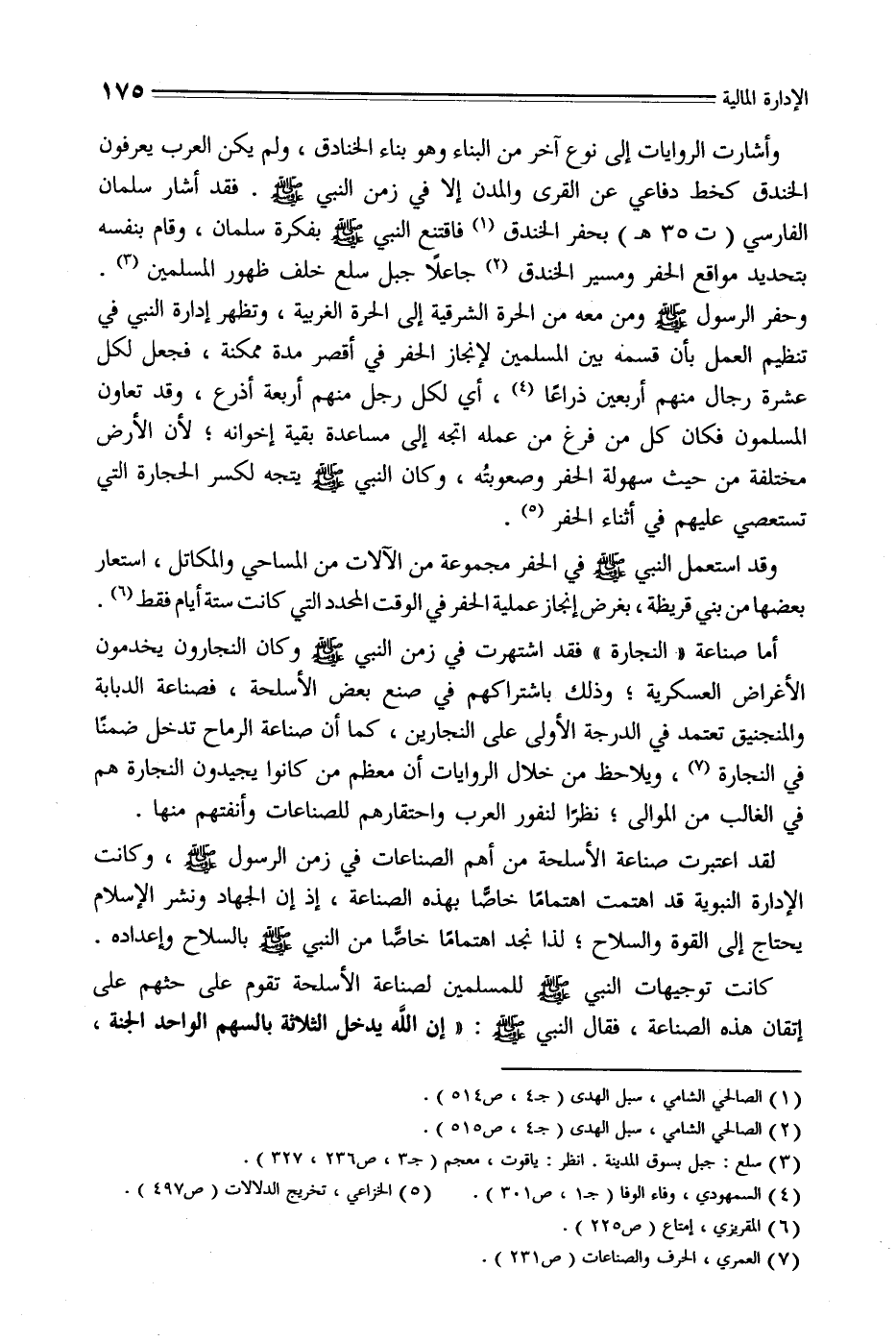 وأشارت الروايات إلى نوع اخر من البناء وهو بناء الخنادق، ولم يكن العرب يعرفون الخندق كخط دفاعي عن القرى والمدن إلا في زمن النبي صلّى الله عليه وسلم. فقد أشار سلمان الفارسي (ت 35 هـ) بحفر الخندق «1» فاقتنع النبي صلّى الله عليه وسلم بفكرة سلمان، وقام بنفسه بتحديد مواقع الحفر ومسير الخندق «2» جاعلا جبل سلع خلف ظهور المسلمين «3» .