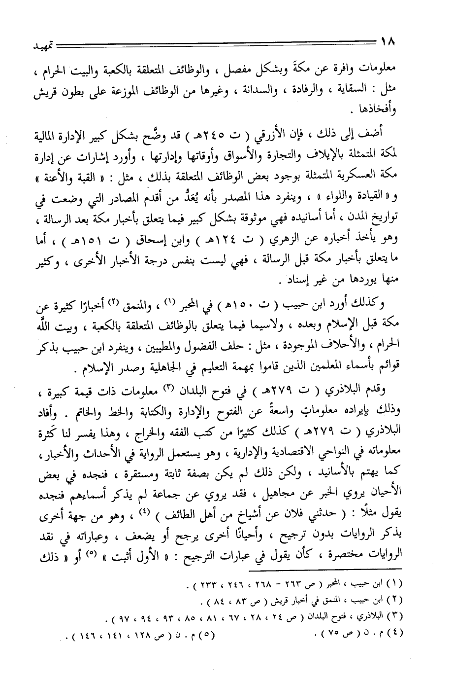 وكذلك أورد ابن حبيب (ت 150 هـ) في المحبر «1» ، والمنمق «2» أخبارا كثيرة عن مكة قبل الإسلام وبعده، ولا سيما فيما يتعلق بالوظائف المتعلقة بالكعبة، وبيت الله الحرام، والأحلاف الموجودة، مثل: حلف الفضول والمطيبين، وينفرد ابن حبيب بذكر قوائم بأسماء المعلمين الذين قاموا بمهمة التعليم في الجاهلية وصدر الإسلام.