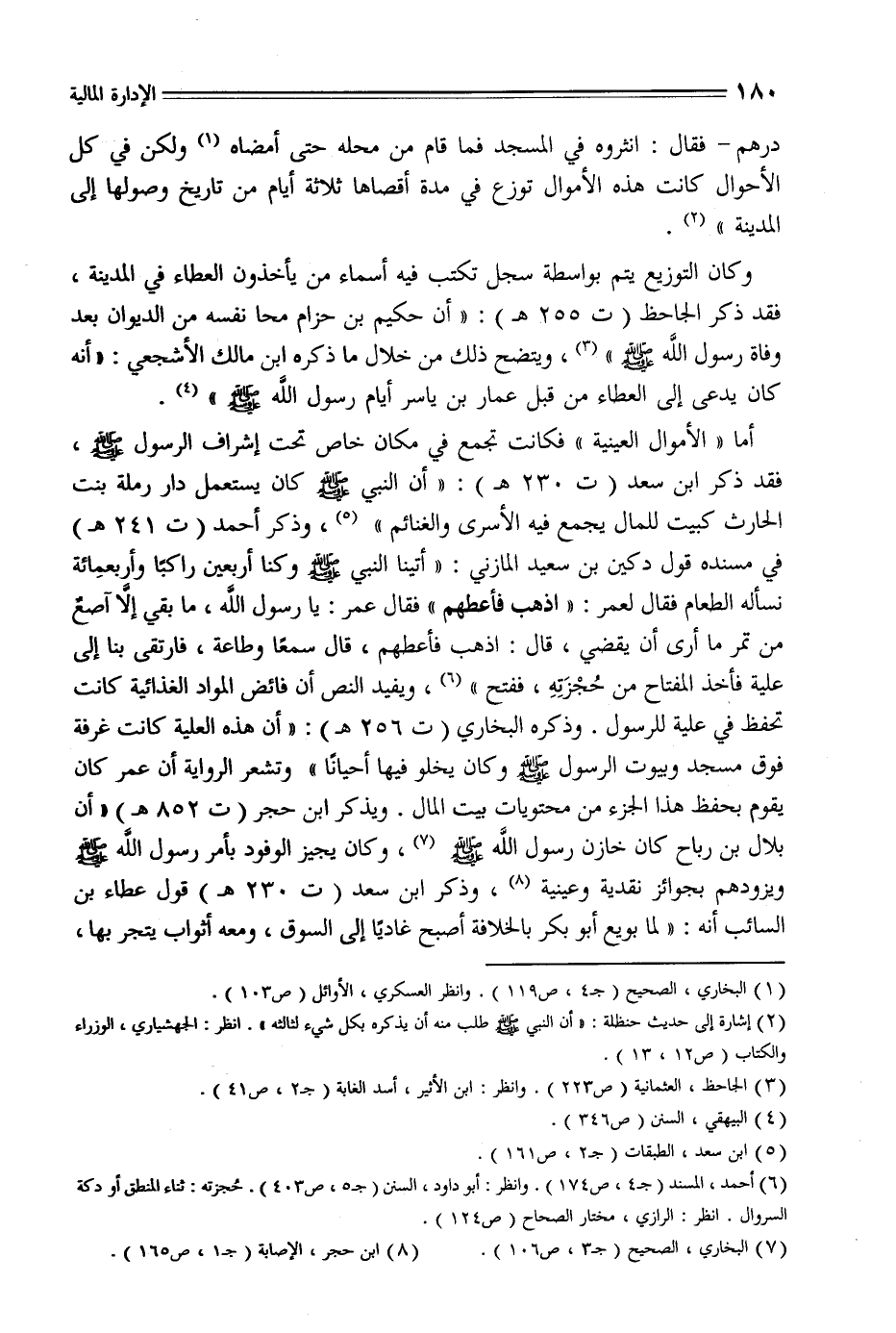 أما «الأموال العينية» فكانت تجمع في مكان خاص تحت إشراف الرسول صلّى الله عليه وسلم، فقد ذكر ابن سعد (ت 230 هـ) : «أن النبي صلّى الله عليه وسلم كان يستعمل دار رملة بنت الحارث كبيت للمال يجمع فيه الأسرى والغنائم» «5» ، وذكر أحمد (ت 241 هـ) في مسنده قول دكين بن سعيد المازني: «أتينا النبي صلّى الله عليه وسلم وكنا أربعين راكبا وأربعمائة نسأله الطعام فقال لعمر: «اذهب فأعطهم» فقال عمر: يا رسول الله، ما بقي إلّا اصع من تمر ما أرى أن يقضي، قال: اذهب فأعطهم، قال سمعا وطاعة، فارتقى بنا إلى علية فأخذ المفتاح من حجزته، ففتح» «6» ، ويفيد النص أن فائض المواد الغذائية كانت تحفظ في علية للرسول. وذكره البخاري (ت 256 هـ) : «أن هذه العلية كانت غرفة فوق مسجد وبيوت الرسول صلّى الله عليه وسلم وكان يخلو فيها أحيانا» وتشعر الرواية أن عمر كان يقوم بحفظ هذا الجزء من محتويات بيت المال. ويذكر ابن حجر (ت 852 هـ) «أن بلال بن رباح كان خازن رسول الله صلّى الله عليه وسلم «7» ، وكان يجيز الوفود بأمر رسول الله صلّى الله عليه وسلم ويزودهم بجوائز نقدية وعينية «8» ، وذكر ابن سعد (ت 230 هـ) قول عطاء بن السائب أنه: «لما بويع أبو بكر بالخلافة أصبح غاديا إلى السوق، ومعه أثواب يتجر بها،
