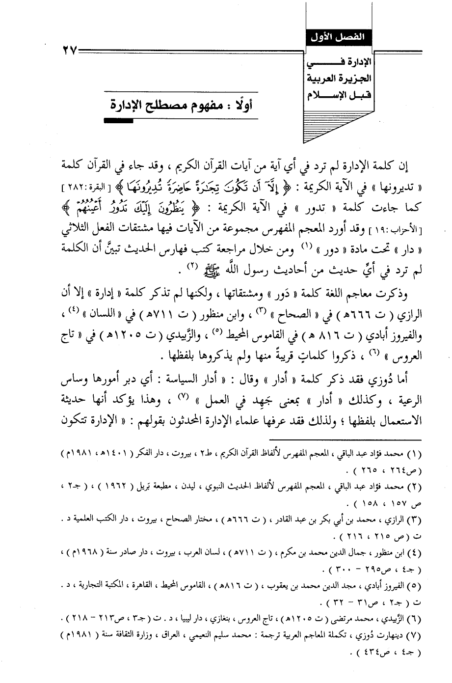 أما دوزي فقد ذكر كلمة «أدار» وقال: «أدار السياسة: أي دبر أمورها وساس الرعية، وكذلك «أدار» بمعنى جهد في العمل» «7» ، وهذا يؤكد أنها حديثة الاستعمال بلفظها؛ ولذلك فقد عرفها علماء الإدارة المحدثون بقولهم: «الإدارة تتكون