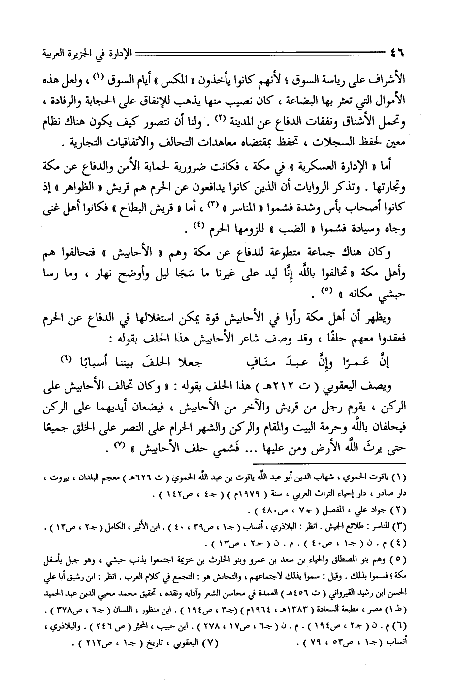 أما «الإدارة العسكرية» في مكة، فكانت ضرورية لحماية الأمن والدفاع عن مكة وتجارتها. وتذكر الروايات أن الذين كانوا يدافعون عن الحرم هم قريش «الظواهر» إذ كانوا أصحاب بأس وشدة فسموا «المناسر» «3» ، أما «قريش البطاح» فكانوا أهل غنى وجاه وسيادة فسموا «الضب» للزومها الحرم «4» .