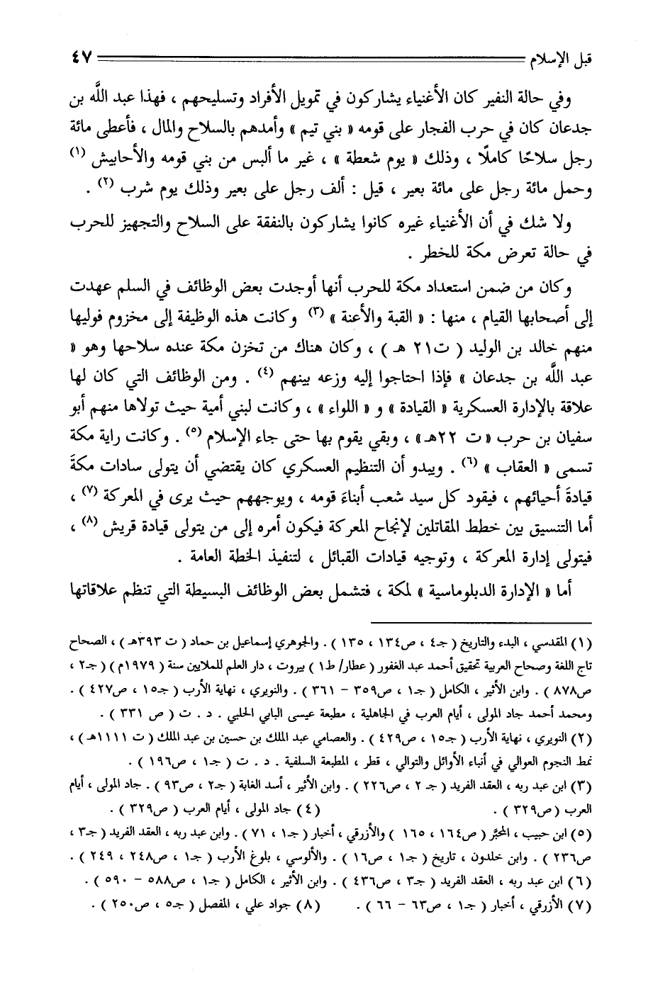 وكان من ضمن استعداد مكة للحرب أنها أوجدت بعض الوظائف في السلم عهدت إلى أصحابها القيام، منها: «القبة والأعنة» «3» وكانت هذه الوظيفة إلى مخزوم فوليها منهم خالد بن الوليد (ت 21 هـ) ، وكان هناك من تخزن مكة عنده سلاحها وهو «عبد الله بن جدعان» فإذا احتاجوا إليه وزعه بينهم «4» . ومن الوظائف التي كان لها علاقة بالإدارة العسكرية «القيادة» و «اللواء» ، وكانت لبني أمية حيث تولاها منهم أبو سفيان بن حرب «ت 22 هـ» ، وبقي يقوم بها حتى جاء الإسلام «5» . وكانت راية مكة تسمى «العقاب» «6» . ويبدو أن التنظيم العسكري كان يقتضي أن يتولى سادات مكة قيادة أحيائهم، فيقود كل سيد شعب أبناء قومه، ويوجههم حيث يرى في المعركة «7» ، أما التنسيق بين خطط المقاتلين لإنجاح المعركة فيكون أمره إلى من يتولى قيادة قريش «8» ، فيتولى إدارة المعركة، وتوجيه قيادات القبائل، لتنفيذ الخطة العامة.