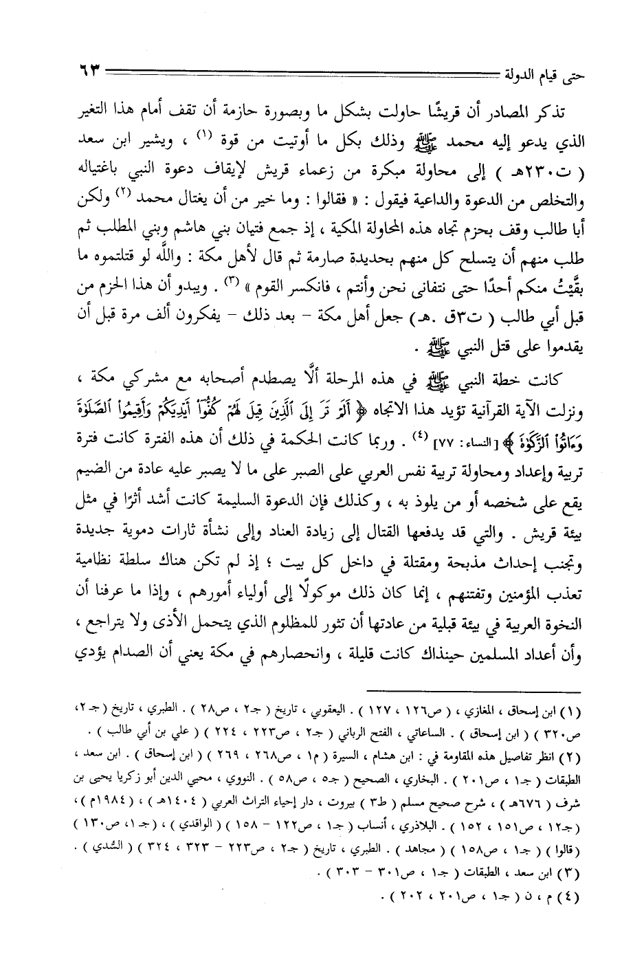 (2) انظر تفاصيل هذه المقاومة في: ابن هشام، السيرة (م 1، ص 268، 269) (ابن إسحاق) . ابن سعد، الطبقات (ج 1، ص 201) . البخاري، الصحيح (ج 5، ص 58) . النووي، محيي الدين أبو زكريا يحيى بن شرف (676 هـ) ، شرح صحيح مسلم (ط 3) بيروت، دار إحياء التراث العربي (1404 هـ) ، (1984 م) ، (ج 12، ص 151، 152) . البلاذري، أنساب (ج 1، ص 122- 158) (الواقدي) ، (ج 1، ص 130) (قالوا) (ج 1، ص 158) (مجاهد) . الطبري، تاريخ (ج 2، ص 223- 323، 324) (السّدي) .