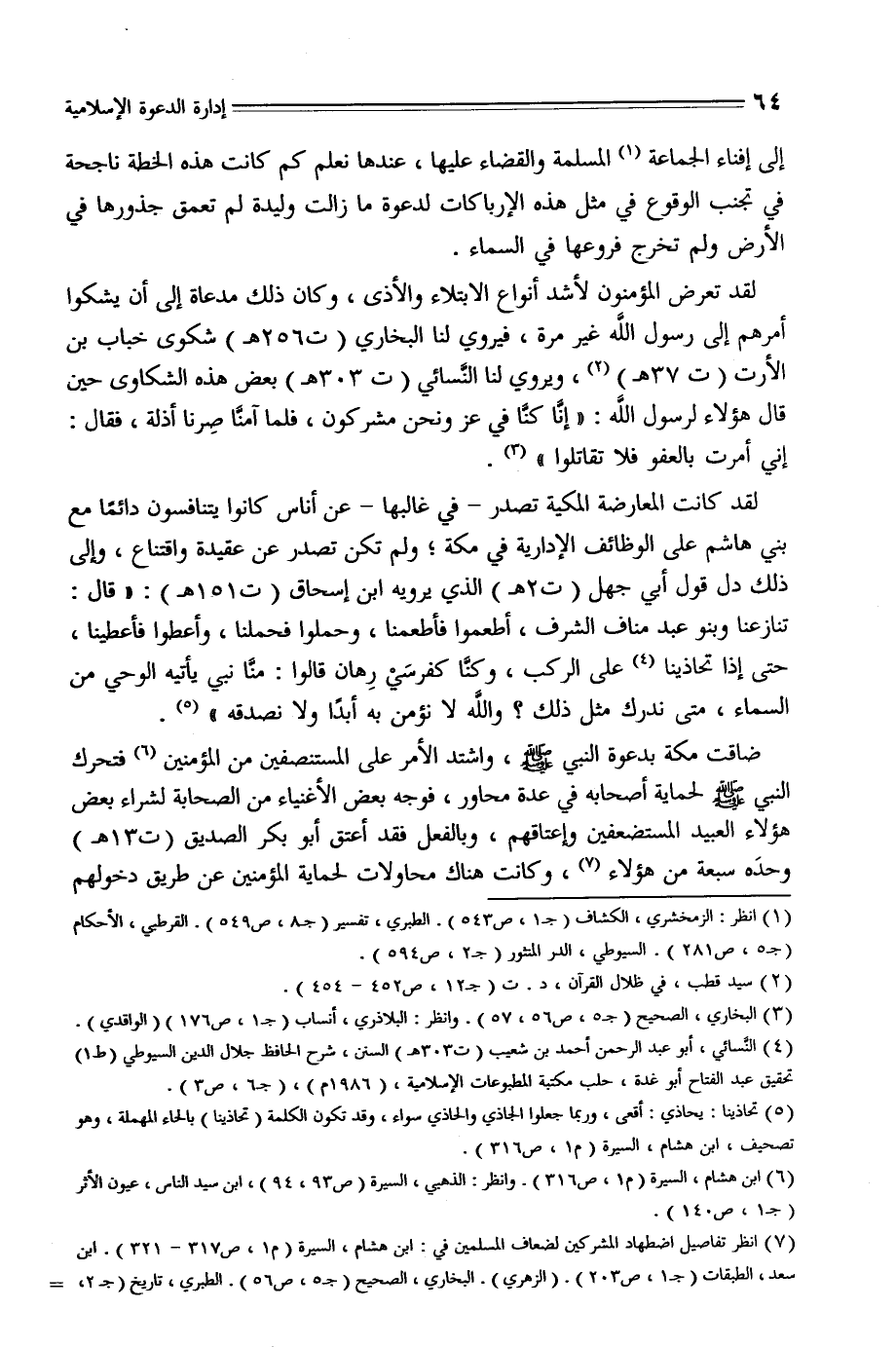 (7) انظر تفاصيل اضطهاد المشركين لضعاف المسلمين في: ابن هشام، السيرة (م 1، ص 317- 321) . ابن سعد، الطبقات (ج 1، ص 203) . (الزهري) . البخاري، الصحيح (ج 5، ص 56) . الطبري، تاريخ (ج 2، -