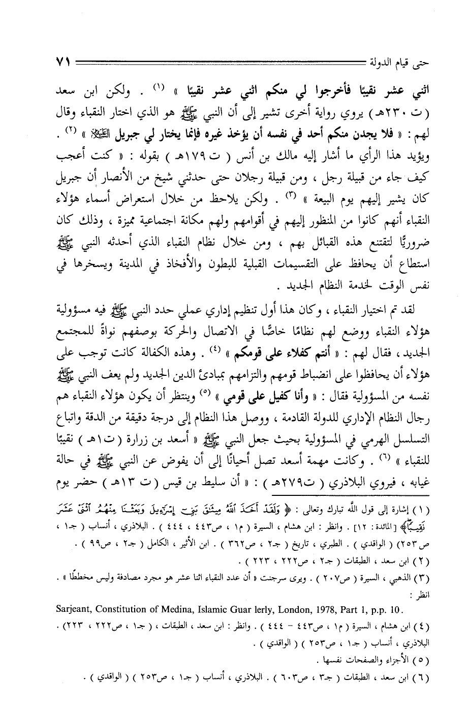 (3) الذهبي، السيرة (ص 207) . ويرى سرجنت «أن عدد النقباء اثنا عشر هو مجرد مصادفة وليس مخططا» . انظر: