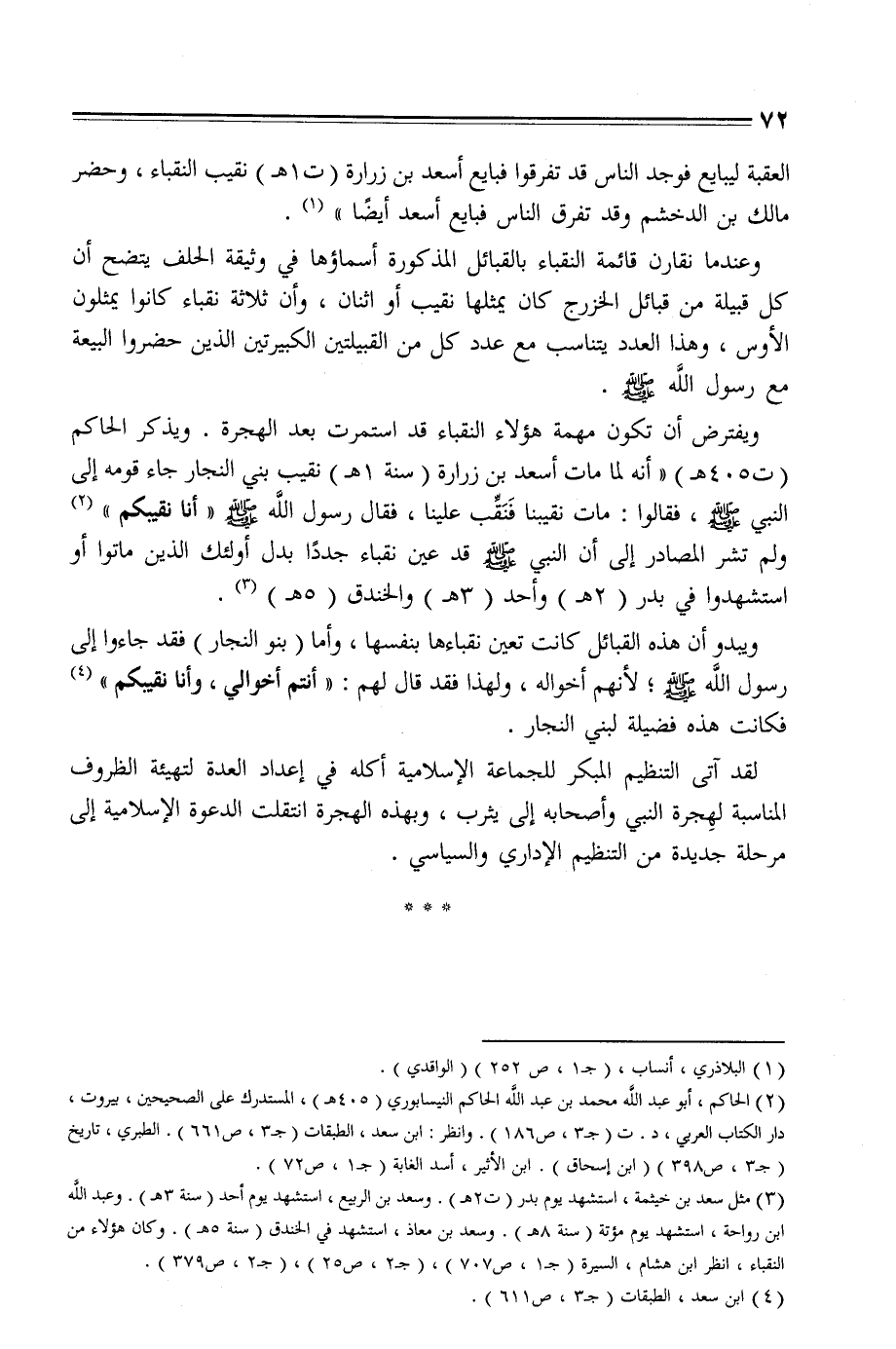(3) مثل سعد بن خيثمة، استشهد يوم بدر (ت 2 هـ) . وسعد بن الربيع، استشهد يوم أحد (سنة 3 هـ) . وعبد الله ابن رواحة، استشهد يوم مؤتة (سنة 8 هـ) . وسعد بن معاذ، استشهد في الخندق (سنة 5 هـ) . وكان هؤلاء من النقباء، انظر ابن هشام، السيرة (ج 1، ص 707) ، (ج 2، ص 25) ، (ج 2، ص 379) .