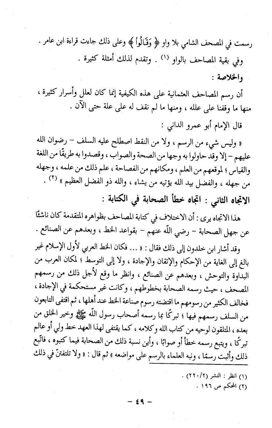 "وليس شيء من الرسم، ولا من النقط اصطلح عليه السلف -رضوان الله عليهم- إلا وقد حاولوا به وجها من الصحة والصواب، وقصدوا به طريقا من اللغة والقياس، لموقعهم من العلم، ومكانهم من الفصاحة، علم ذلك من علمه، وجهله من جهله، والفضل بيد الله يؤتيه من يشاء، والله ذو الفضل العظيم"2.