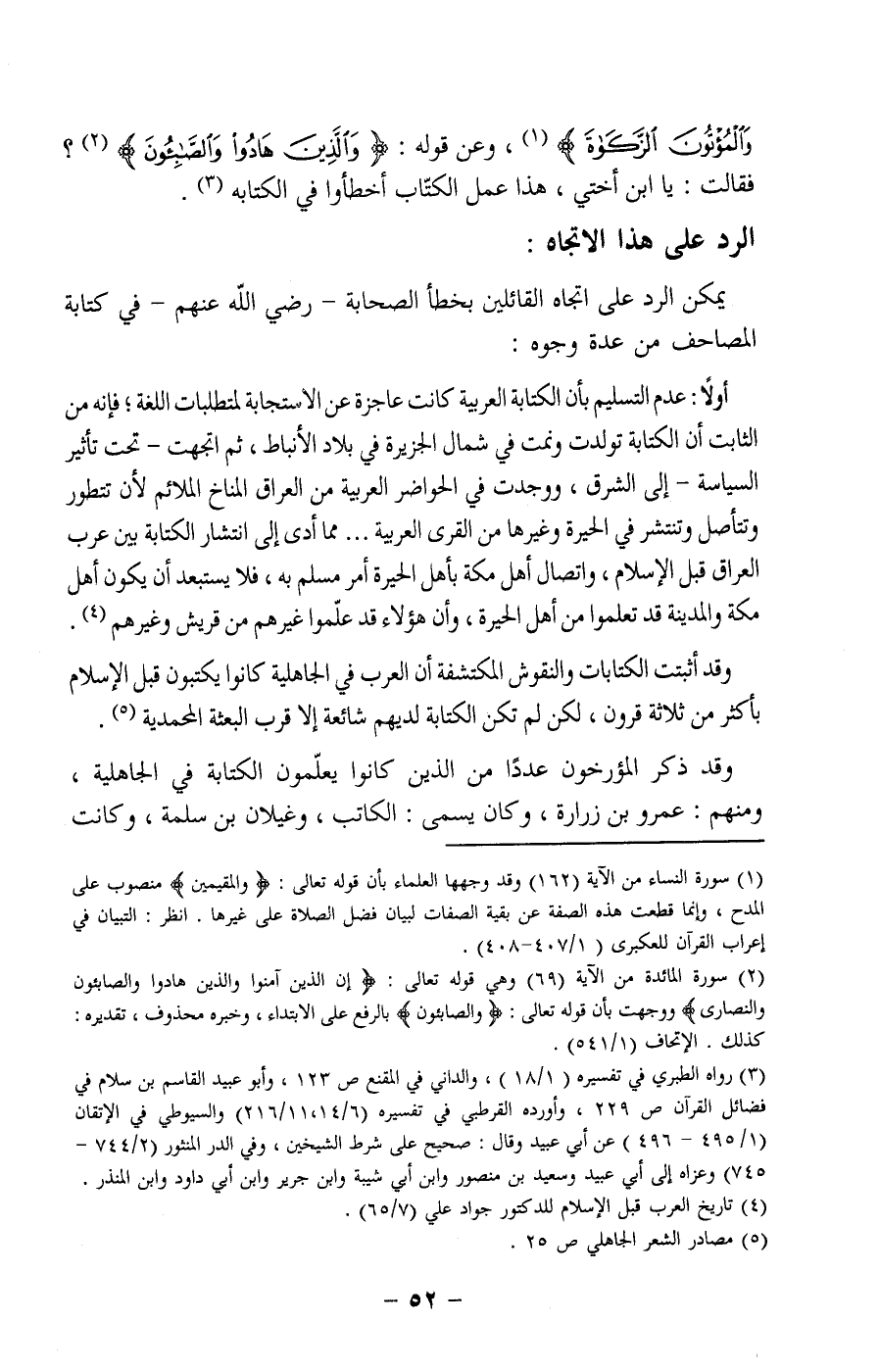 أولا: عدم التسليم بأن الكتابة العربية كانت عاجزة عن الاستجابة لمتطلبات اللغة، فإنه من الثابت أن الكتابة تولدت ونمت في شمال الجزيرة في بلاد الأنباط، ثم اتجهت -تحت تأثير السياسة- إلى الشرق، ووجدت في الحواضر العربية من العراق المناخ الملائم لأن تتطور وتتأصل وتنتشر في الحيرة وغيرها من القرى العربية ... مما أدى إلى انتشار الكتابة بين عرب العراق قبل الإسلام، واتصال أهل مكة بأهل الحيرة أمر مسلم به، فلا يستبعد أن يكون أهل مكة والمدينة قد تعلموا من أهل الحيرة، وأن هؤلاء قد علموا غيرهم من قريش وغيرهم4.